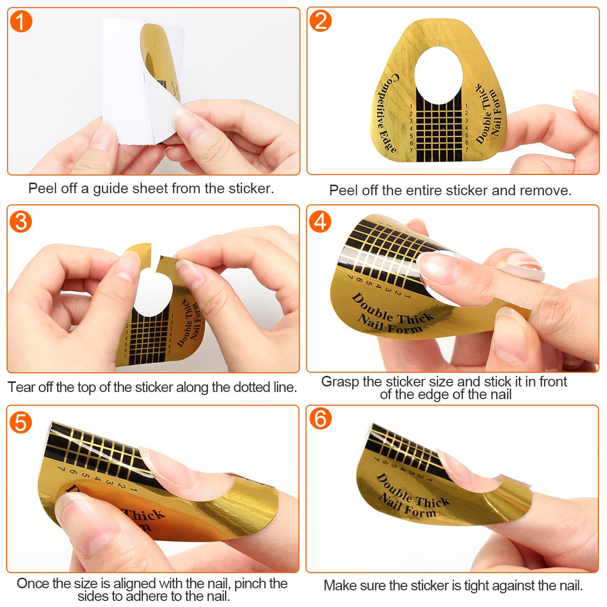 - 【Usage】After you manicure your nails thoroughly, tear off the nail form from a sticker, remove the middle oval-shaped and tear open the ring along the dotted line. hold the scale of the label at the front of the nail edge and keep the extension on the same plane as the nail, then pinch both sides of the forms when the scale fits with the finger, make sure the tips are tight close to your finger, and then apply with poly gel and cure it, final filing the ideal shape and length you want.