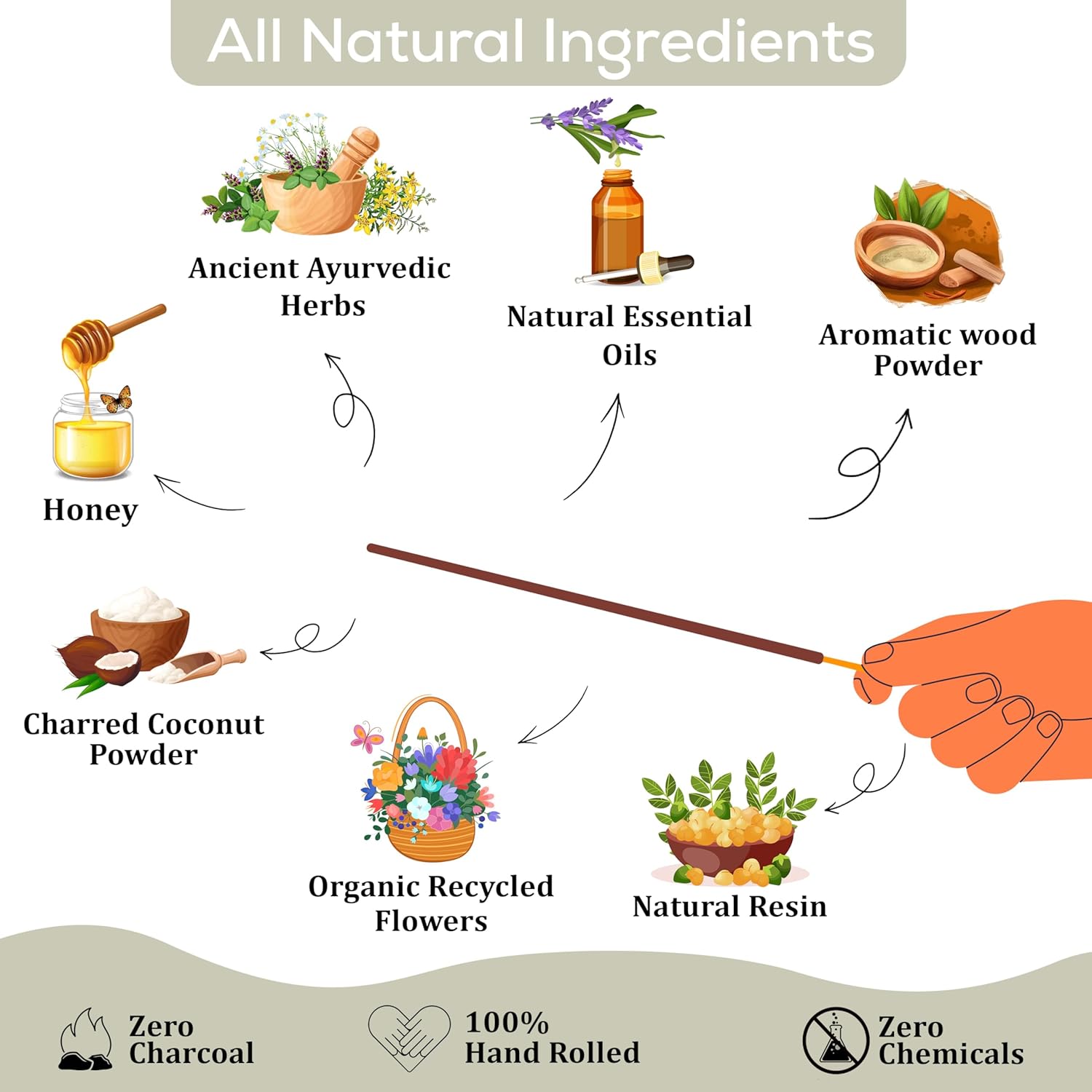 - 100% NATURAL -Raajsee incense sticks variety pack is completely handmade MADE FROM SCRATCH by blending natural resins, Herbs, and natural incense with aromatic wood powders, charred coconut powder fragrant oils, and honey. No Dipping in Toxic Chemicals, organic incense sticks non toxic