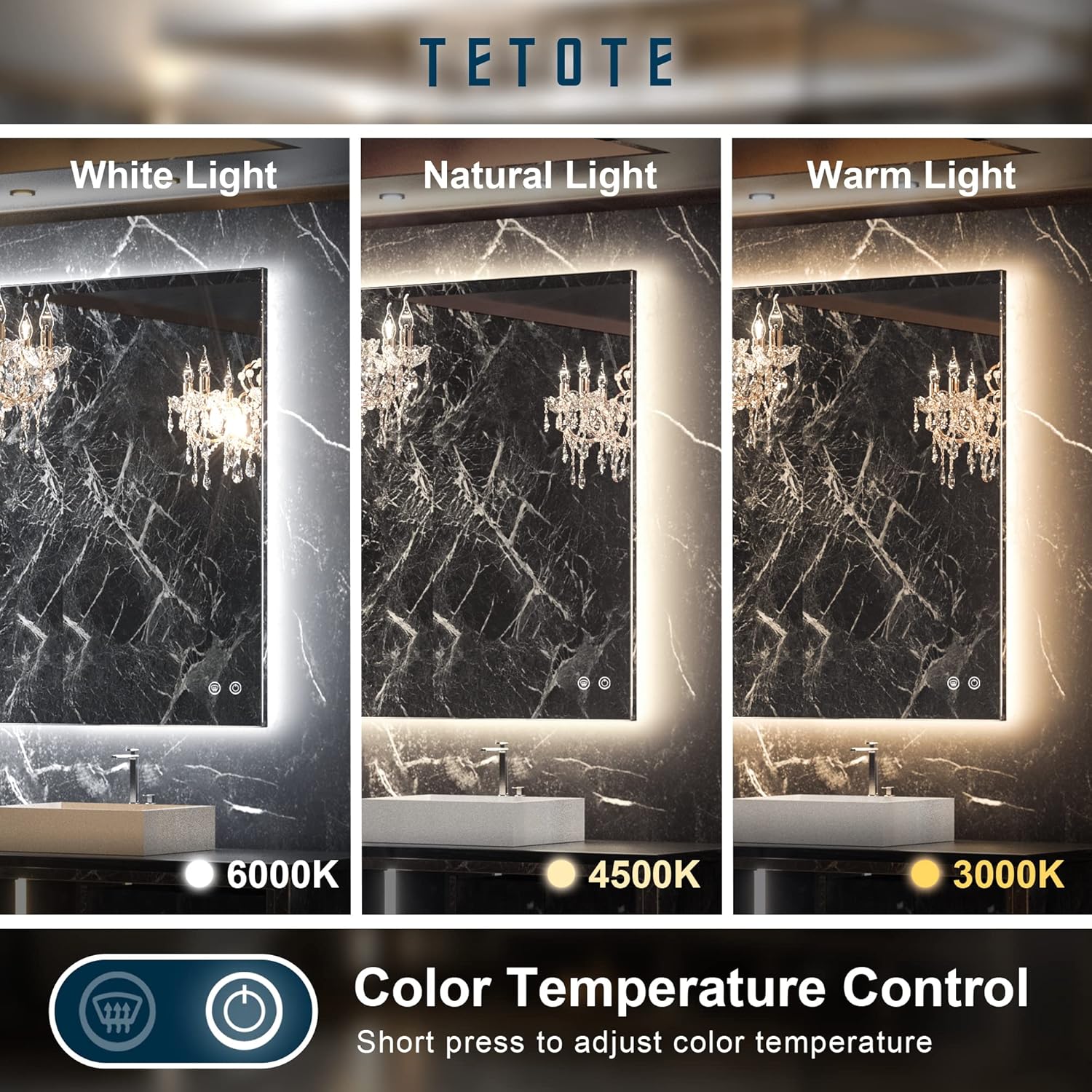 TETOTE 20 x 28 LED Backlit Bathroom Mirror with Light,3Color White/Warm/Natural,Anti-Fog Lighted Mirror,Dimmable,Vanity Mirror,Wall Mounted