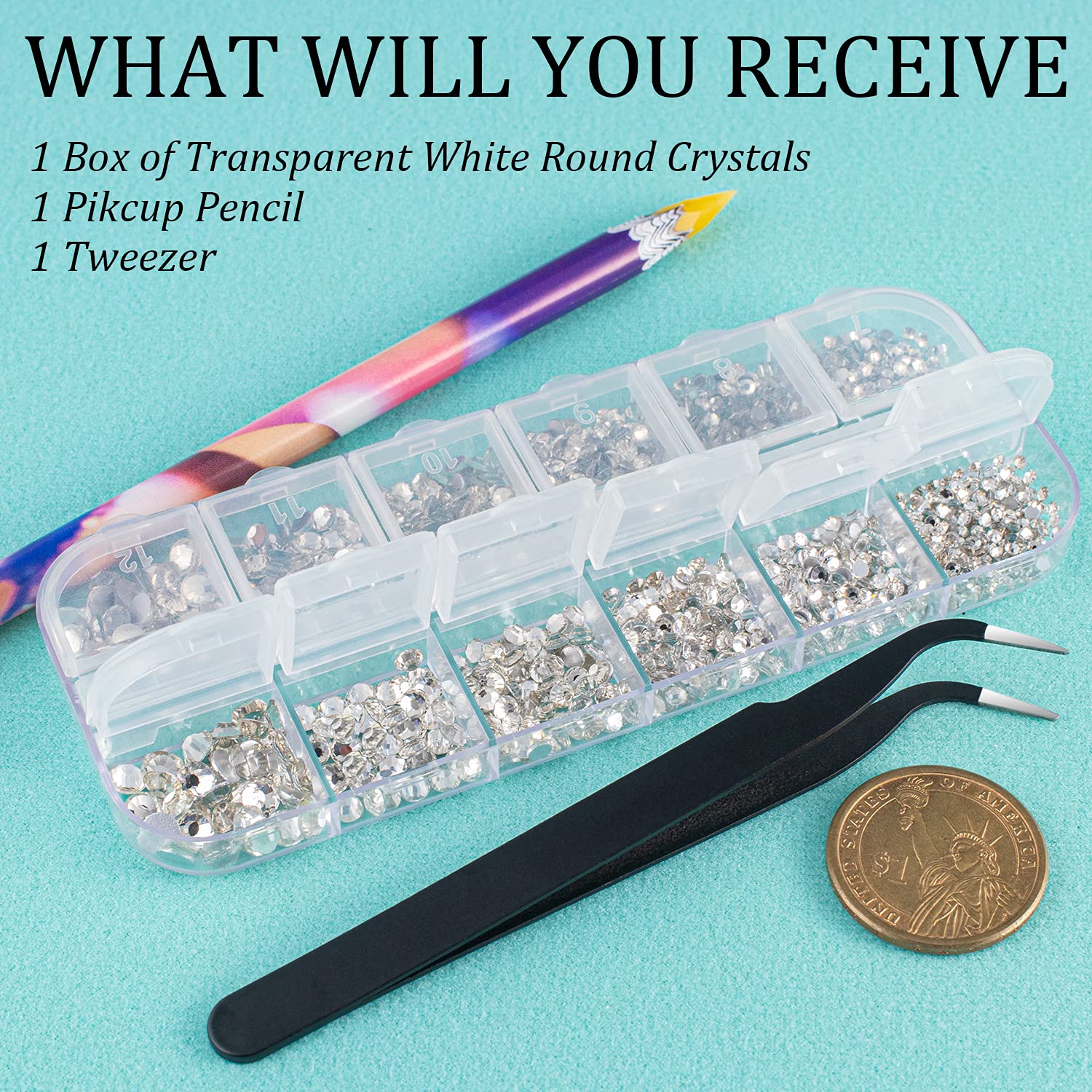 - ❤WHAT YOU WILL RECEIVE -- 1 Box of 6 Sizes Transparent White Round Glass Nail Crystal Rhinestones Beads (Totally About 1720 PCS); 1 PCS Rhinestone Picker Pencil; 1 PCS Tweezer. The Well Equipped Rhinestone Set Is Suitable for Both Professional Nail Technician and Inexperienced Starter for Nail Art.