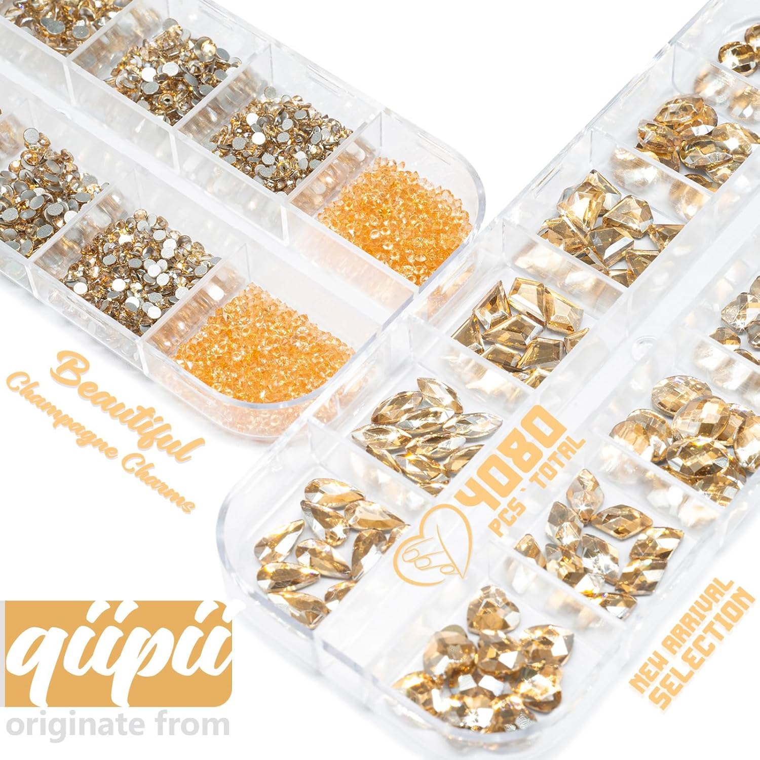 - ❤【12 Kinds Shapes Flatback K9 Glass Rhinestones】12 kinds different of kawaii shapes, each includes 10 pcs, total 120pcs. The shiny diamonds stones for nail are designed with different style, like heart rhinestones, diamond rhinestones, round rhinestones, rhombus rhinestones, arrow rhinestones, oval rhinestones, Horse eye rhinestones, melon seed rhinestones, water drop rhinestones etc. Champagne Gold crystal rhinestones w built-in flat backs can be easily applied to natural and artificial nails.