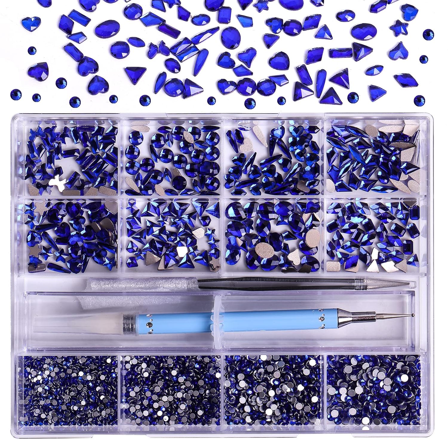 3320Pcs Sapphire Nail Art Rhinestones Crystal,3D Rhinestones Gems Jewels Diamond,24 Types of 320 Diamonds + 3000 Round Beads, Crystals 3D Flat Back Gemstones for Nail DIY Crafts with Tweezers Pen