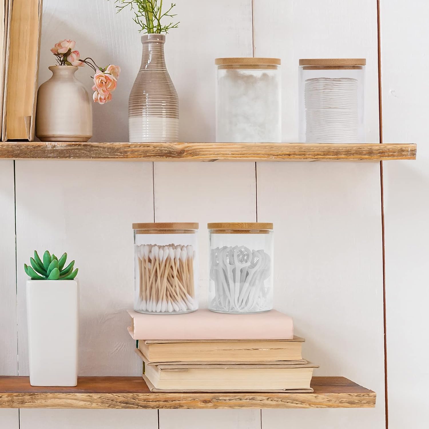 - What You Get: 4 pack Glass Qtip Holder Dispenser; Whether you're looking to declutter your bathroom or simply add a stylish touch, these jars offer the perfect solution. With their ample storage capacity and attractive design, they help you achieve a tidy and organized space while elevating the overall aesthetic of your bathroom.