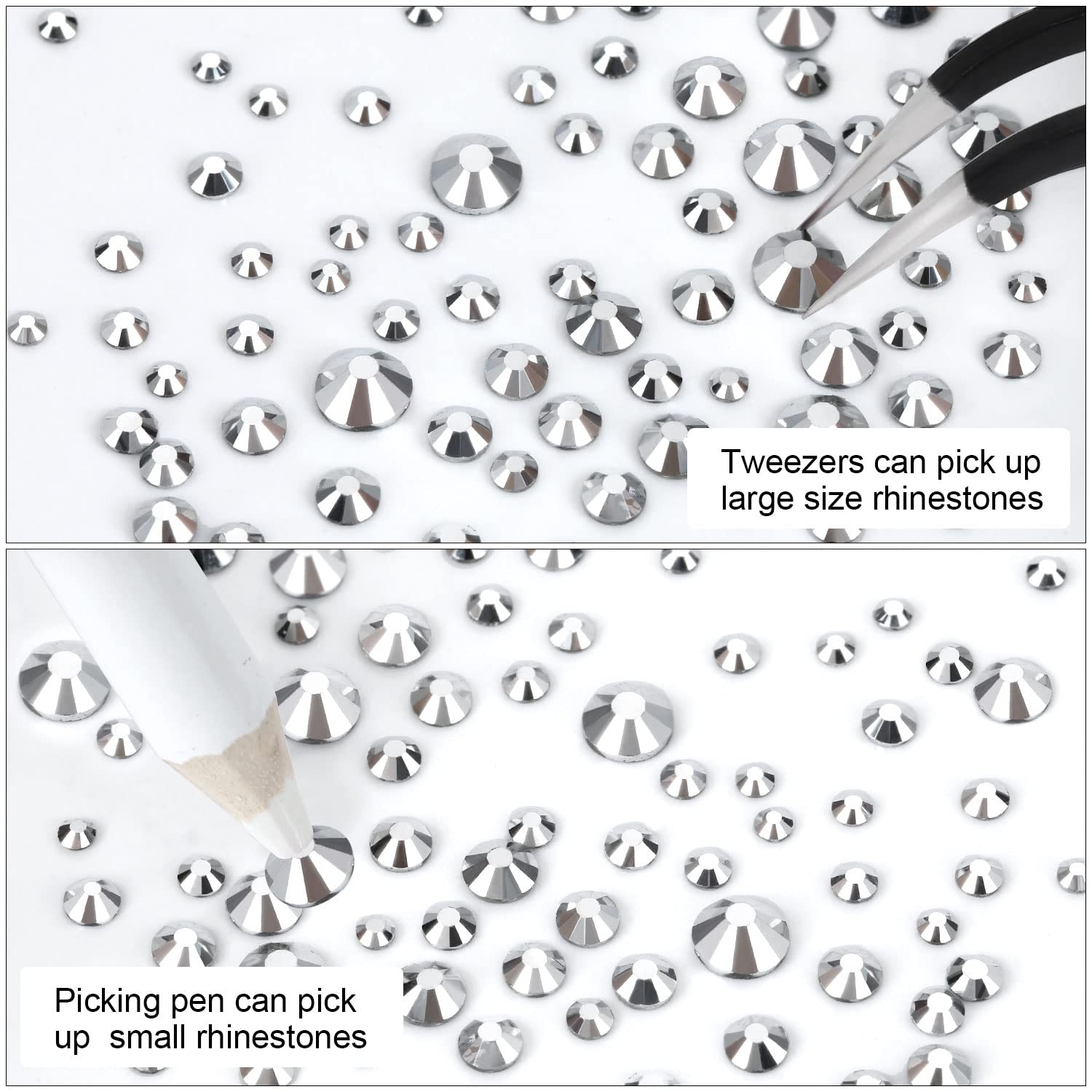 - 💎Use tweezers and Picking Pen gem picker to pick rhinestones, There is no glue on the bottom, additional nail gel is required, or other professional glue for makeup or nails. Can use E6000 super glue to fix on crafts, art decoration. not hotfix.