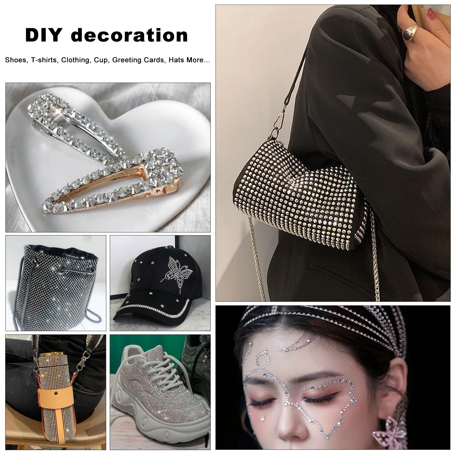 - 💎You can use rhinestones for, Nails, Art, Jewels, Skin, teeth, face, eye, Makeup, tumbler, glass, crafts, cardstock, phone, phone case, plastic, glasses etc. If you are using shoes, clothing, fabric textile type, I suggest you search on Amazon: B09ZQKTW4V