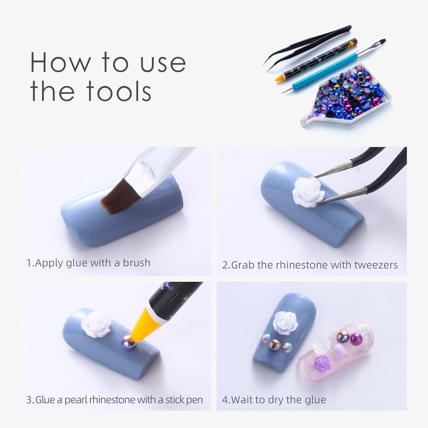 - Useful tools - These pearls and rhinestones have a flat back, which is excellent for easy placement.and you can pick up any large or small pearls and rhinestones with the crayons we bring along. And use the brush to smooth out the Gel, these tools will work very well