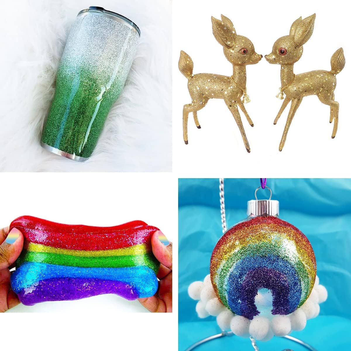 - š.Widely used and Plenty contents: Extra fine glitters can be used in craft making,resin ornament making,holiday decoration,resin jewelry making,epoxy resin tumbler,diy slime,nail art,body art,eye makeup,etc, and it can mix well with a gallon of paint and It sticks great with the paint.