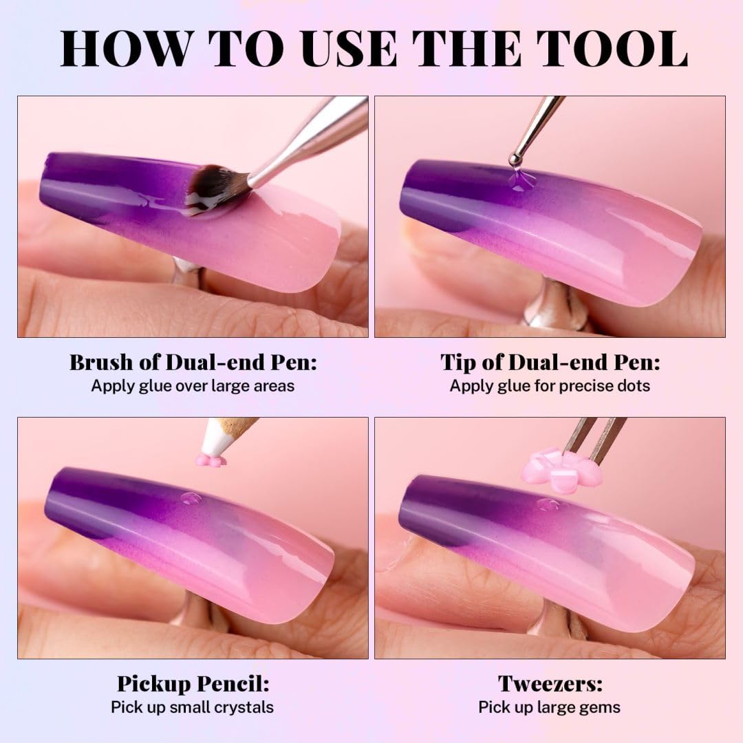 - 💎RHINESTONE DOTTING PICKER TOOLS: The wide-head brush end of the dual-end dotting tool makes it easy to apply a large amount of glue to the nail surface at once, while the other mini dotting end is great for detailed drawing. Picker pen can help you handily pick up small flowers and metal beads, while tweezer is a better choice for big flowers and beads. The craftbeads are not self-adhesive and glue-needed. (glue is not included.)