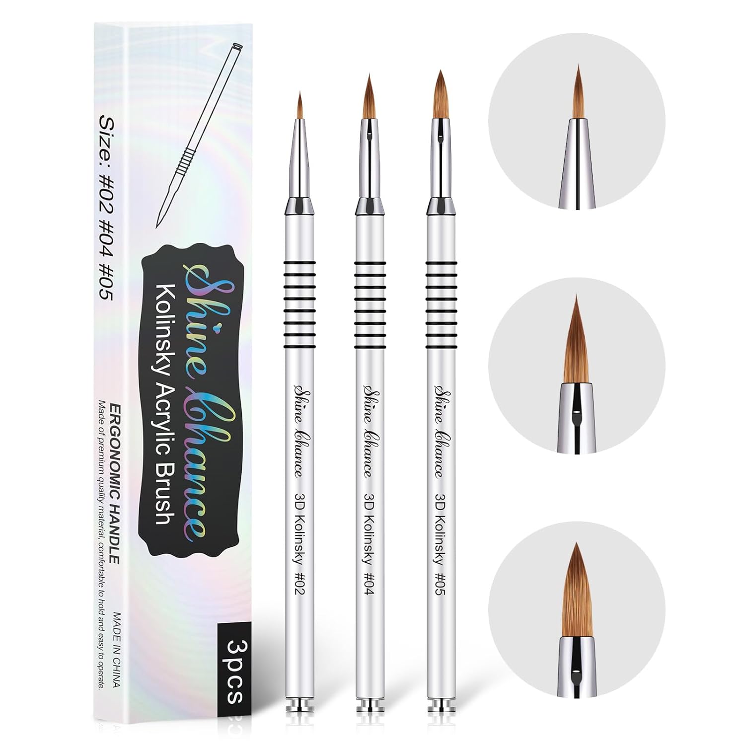 - 🧚♀【Professional Acrylic Nail Brushes Set】: The 3d brush comes with 3 pcs different size silver handle kolinsky nail brushes for art nail, Respectively the size #2 #4 #5. Meets various of different nail art needs. Perfect for acrylic application.