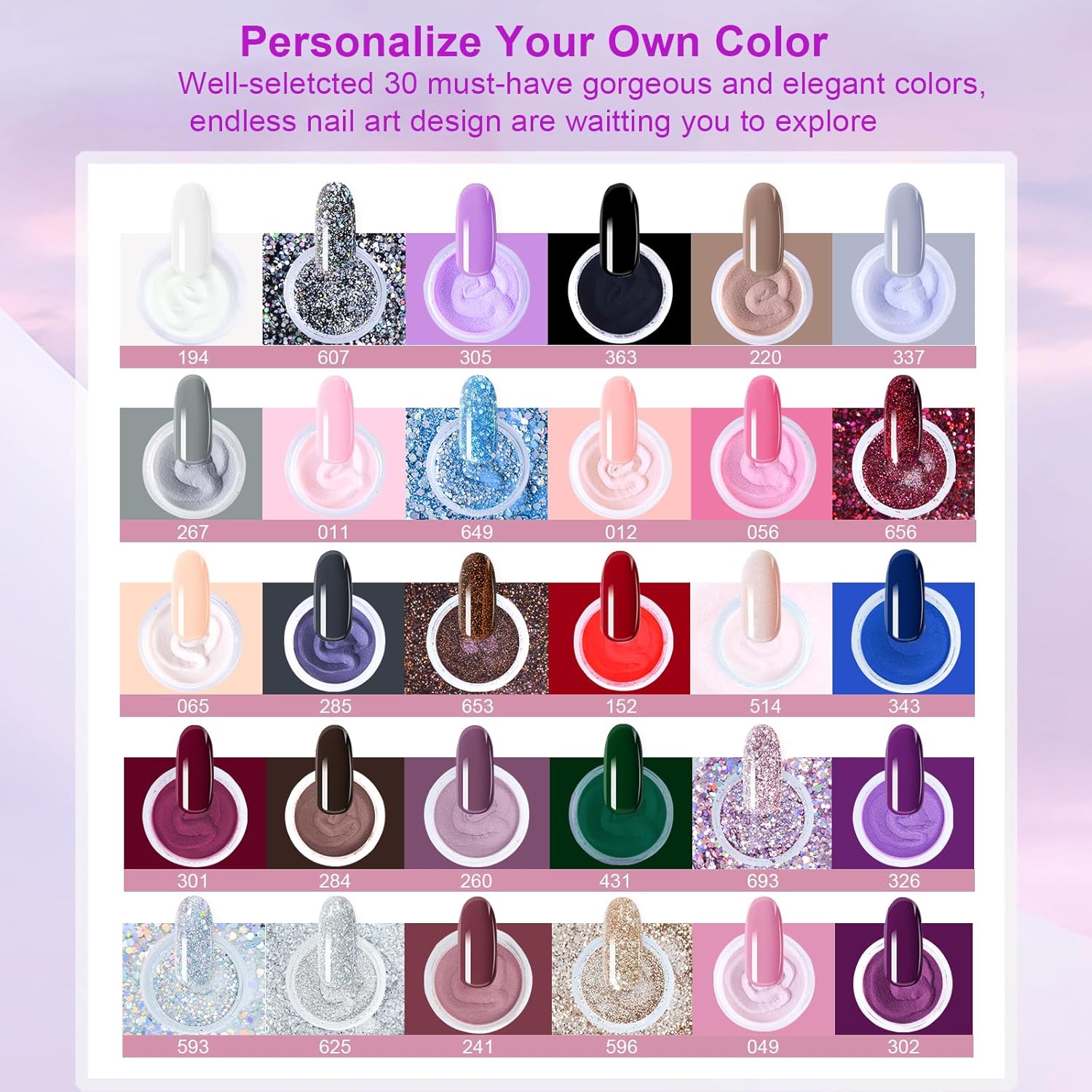 Dip Powder Nail Kit Starter, 30 Colors Dip Nails Skin Nude Brown Glitter, Dark Color Acrylic Dipping Powder Liquid Set with Base/Top Coat Activator Brush Saver for Manicure DIY Gift