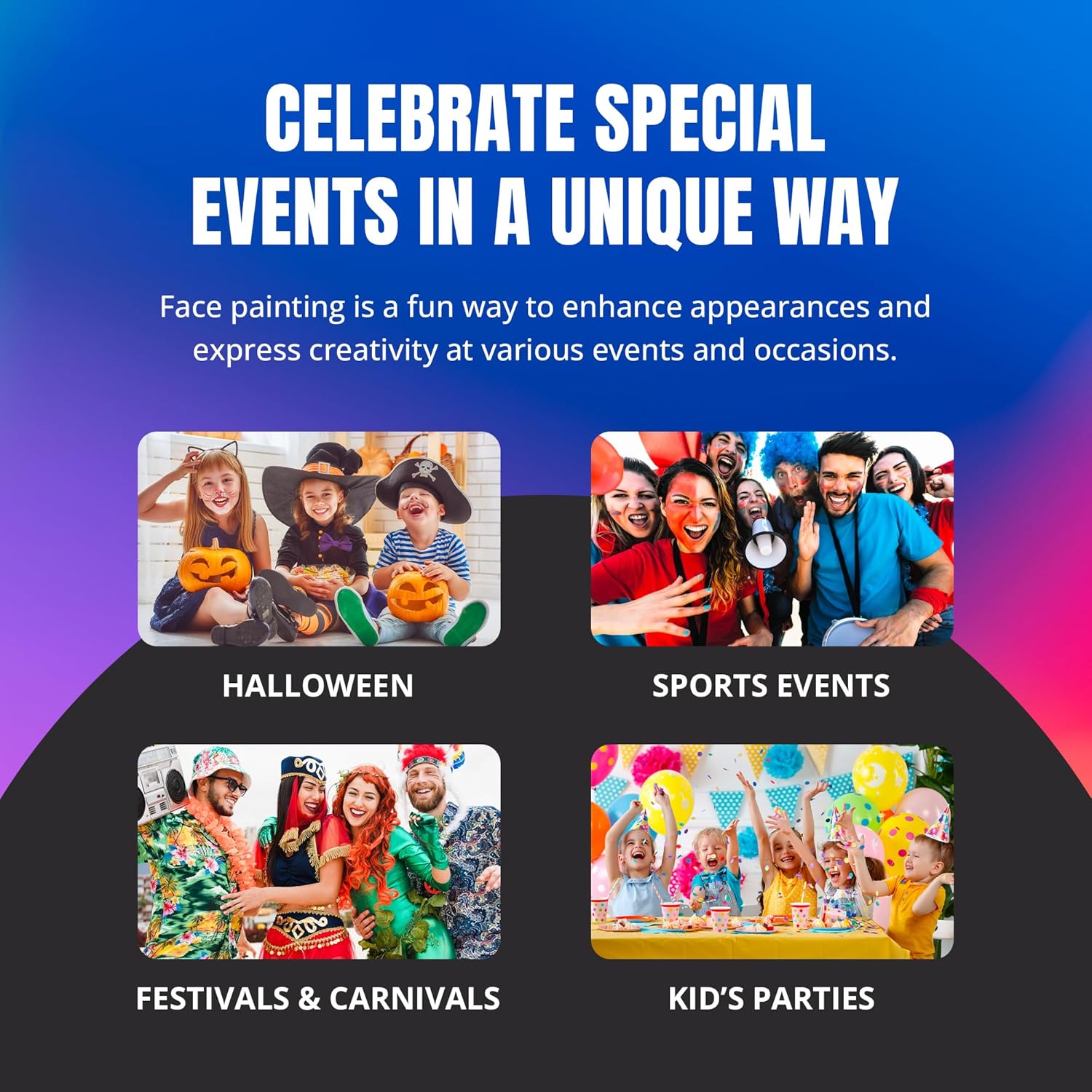 - Complete Spectrum: Dive into a world of face painting using our exceptional water based face paint. This remarkable feature ensures your artistic designs remain intact, even in the midst of spirited Halloween parties