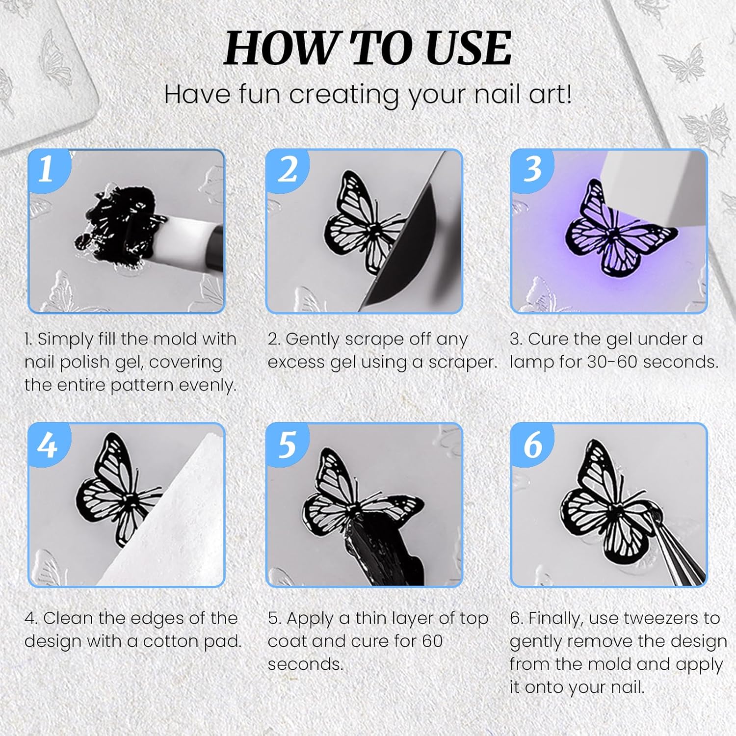 - 【Easy to Use】It is compatible with regular nail polish gel. Simply fill the mold with nail polish gel, covering the entire pattern evenly. Gently scrape off any excess gel. Cure the gel under a lamp for 30-60 seconds. Clean the edges of the design. Apply a thin layer of top coat and cure for 60 seconds. Finally, use tweezers to gently remove the design from the mold and apply it onto your nail.