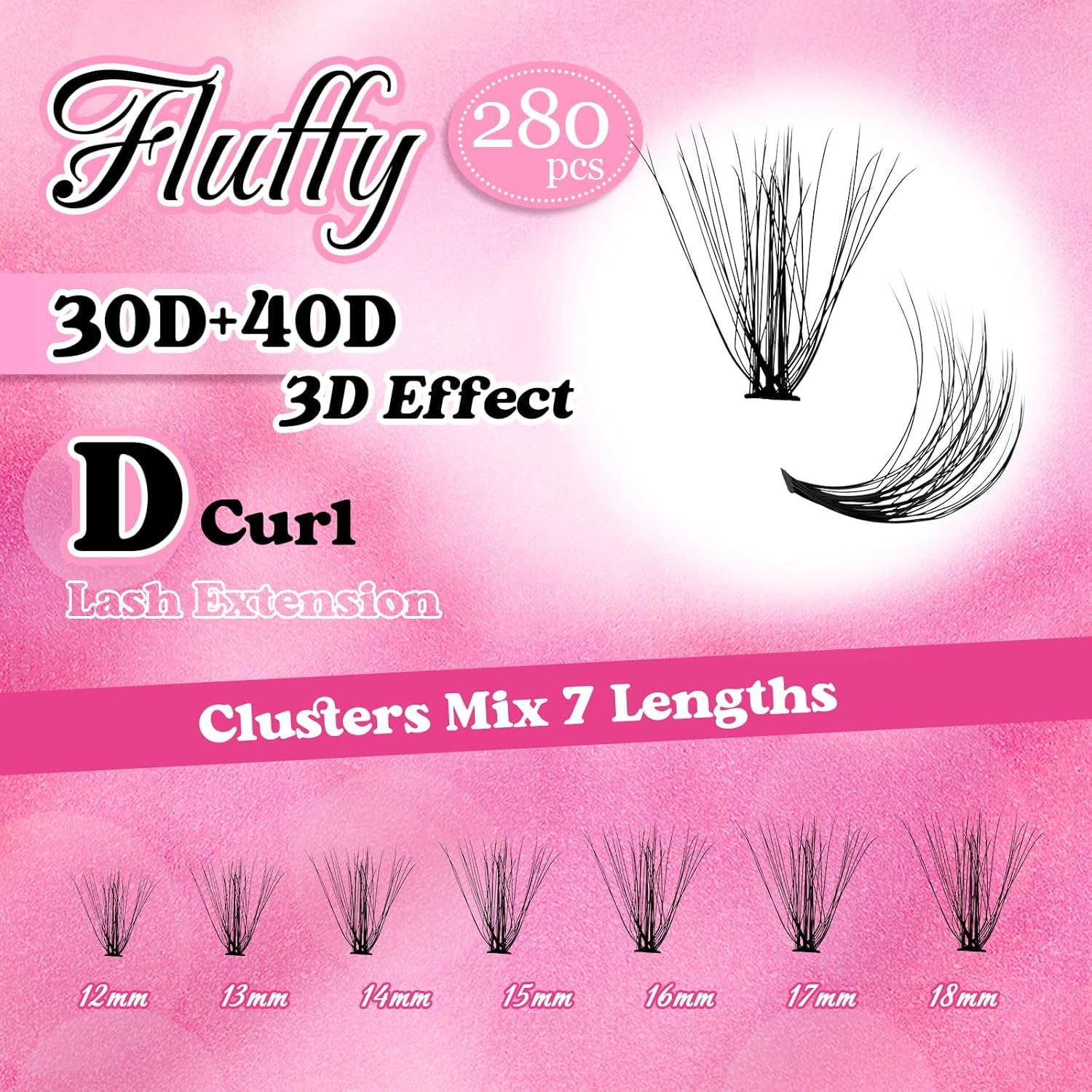 Lash Clusters 240pcs 30D+40D 12-18mm Cluster Lashes Mixed Tray 3D Effect Volume Individual Lashes Cluster Eyelash Extensions Fluffy Soft D Curl DIY Lash Extension Kit at Home (30D+40D-0.07-D,12-18mm)