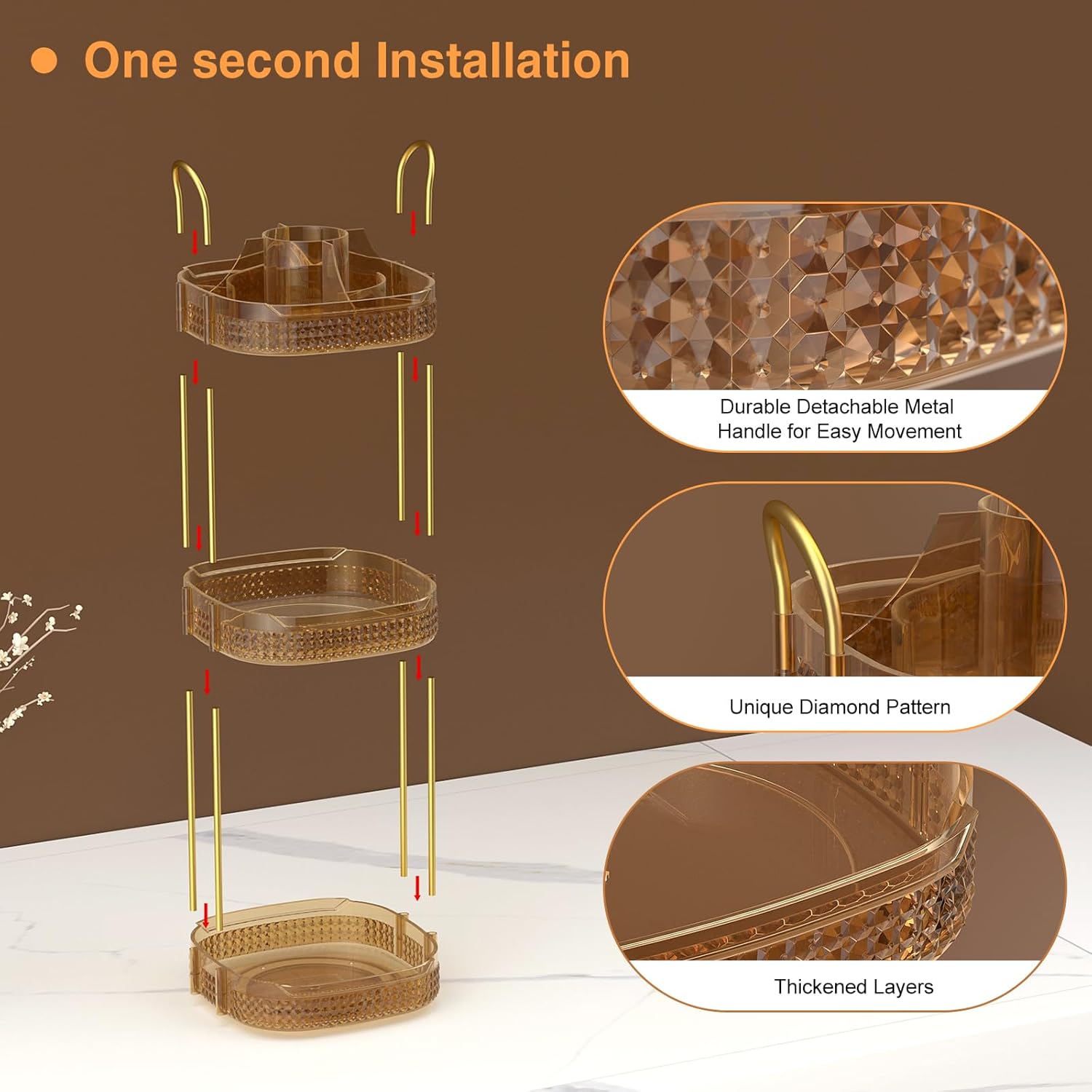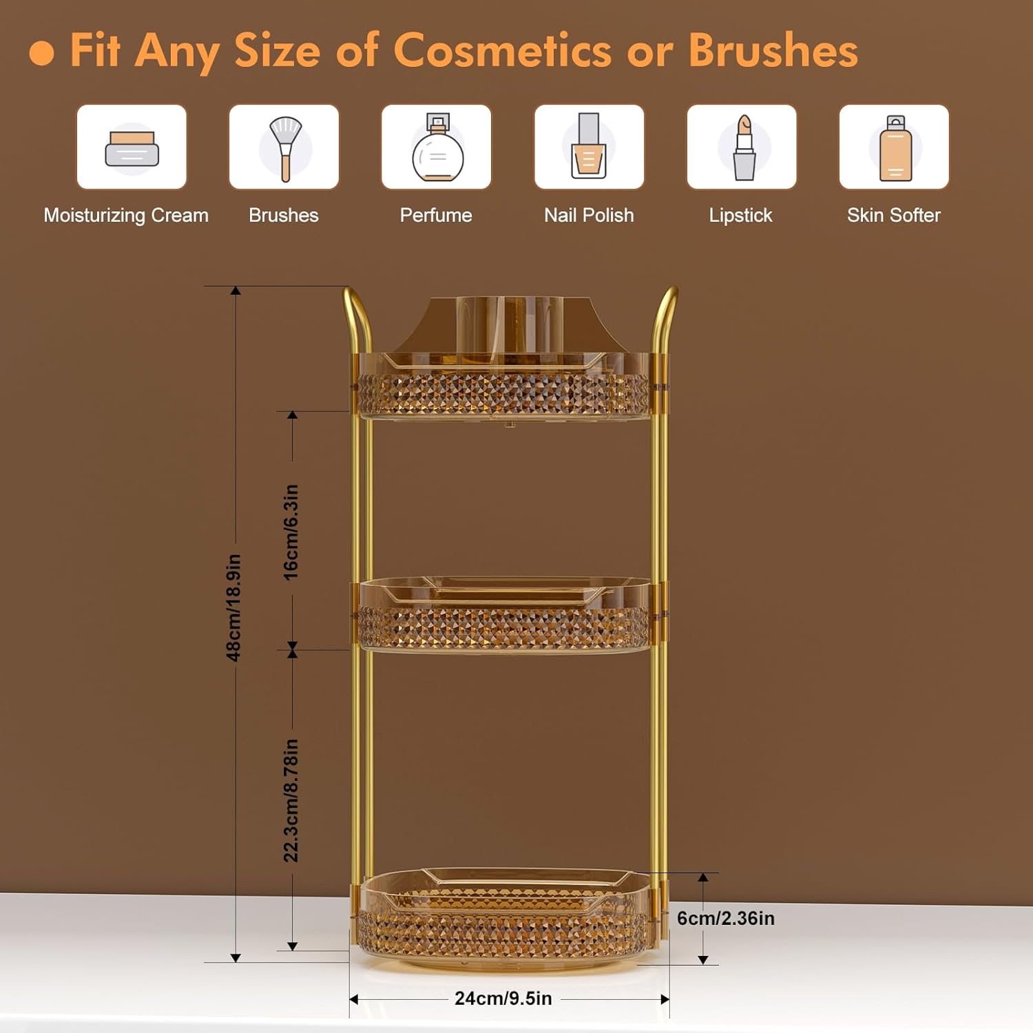 Awenia Rotating Makeup Organizer 360, Stackable Adjustable Large Capacity Cosmetic Storage Unit,Dresser Bathroom Kitchen Countertop Organizer with Metal Handle, Plus Size (Honorable Gold, 3 Tier)