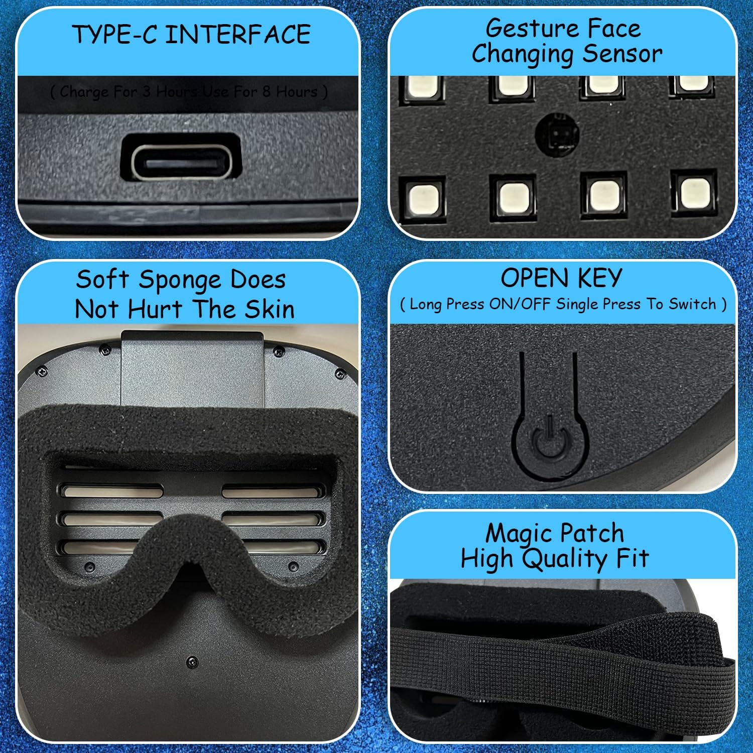 - [Wear Comfortably and High-Quality]: Made of tough plastic and soft sponge. You can wear this led mask for a long time, adjustable straps and large eyelets to ensure your visibility and fit during use. It is lightweight and comfortable to wear without any burden.