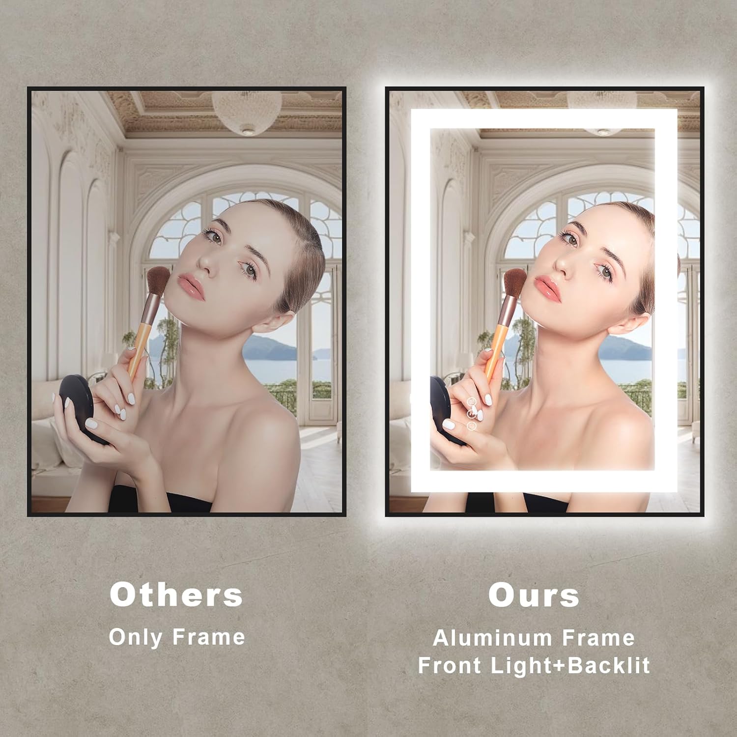 - Matte Black Metal Frame LED Mirror: Unlike other no frame mirrors, our LED mirror for bathroom have thin and durable black metal frame that provides sufficient brightness and elegance look. It combines practicality and modern beauty, is a ideal for decorating bathroom, living room, bedroom, hair salon and hotel.