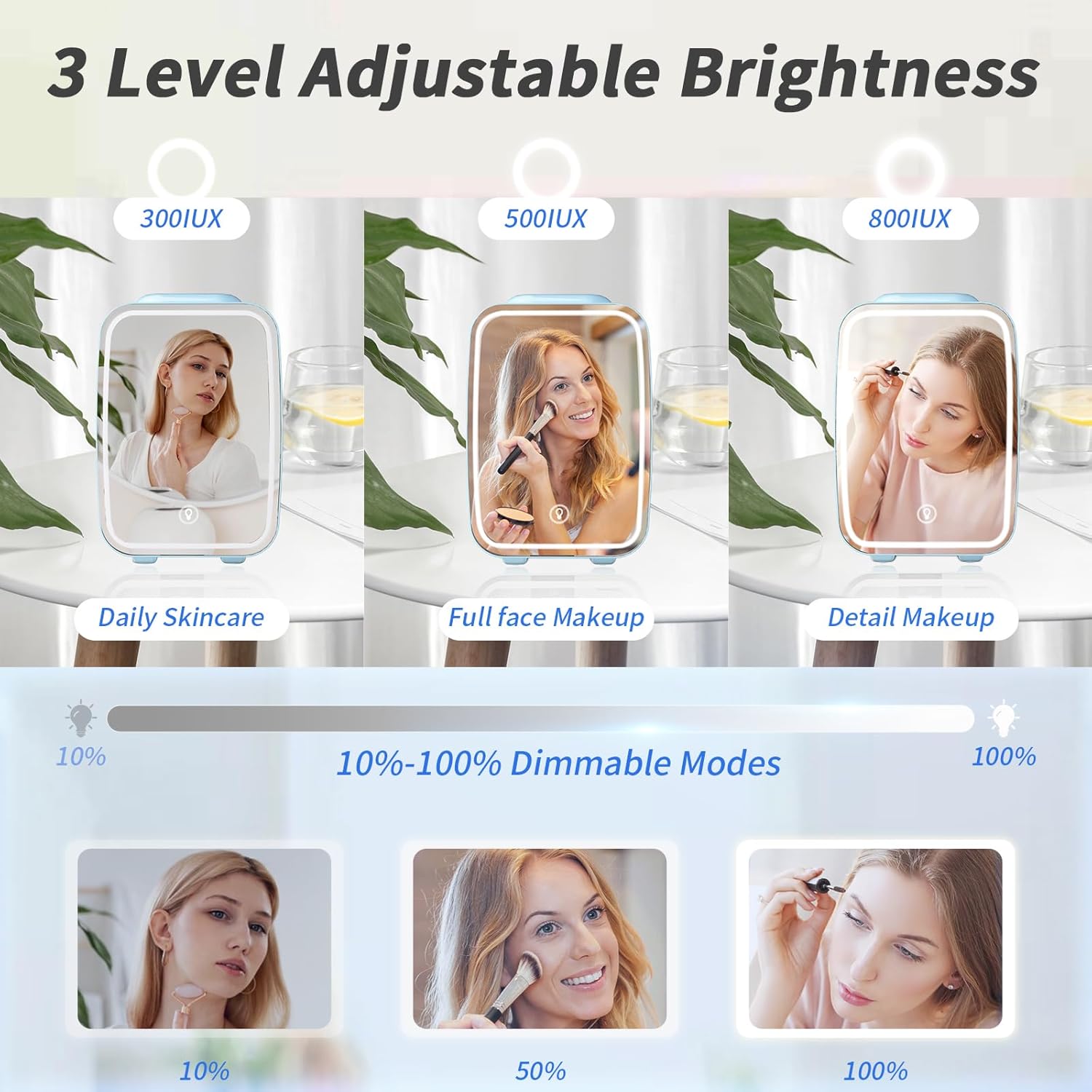 - 3 Level Brightness Adjustable: This mini fridge equipped with a touch screen LED light high-definition mirror glass door, which include low light for daily skincare, medium light for full face makeup and high light for detail makeup. This fridge provides three brightness levels for flawless makeup application and skincare routines, even in dim lighting
