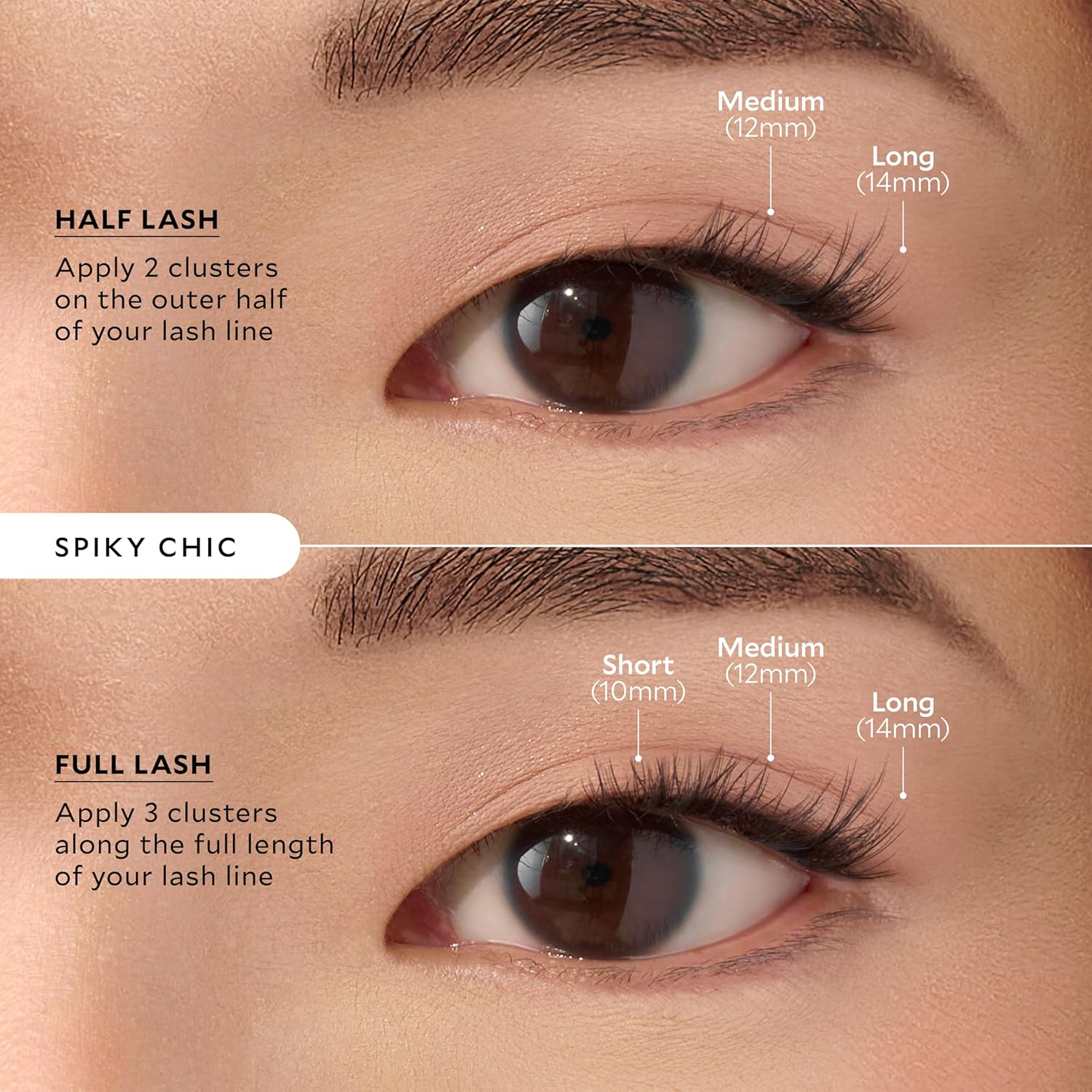 - VALUE CLUSTER EYELASH EXTENSIONS - This pack includes 12x Spiky Chic Velour-Xtensions Self-Stick Lash Clusters: 4x Short (10mm), 4x Medium (12mm), 4x Long (14mm).