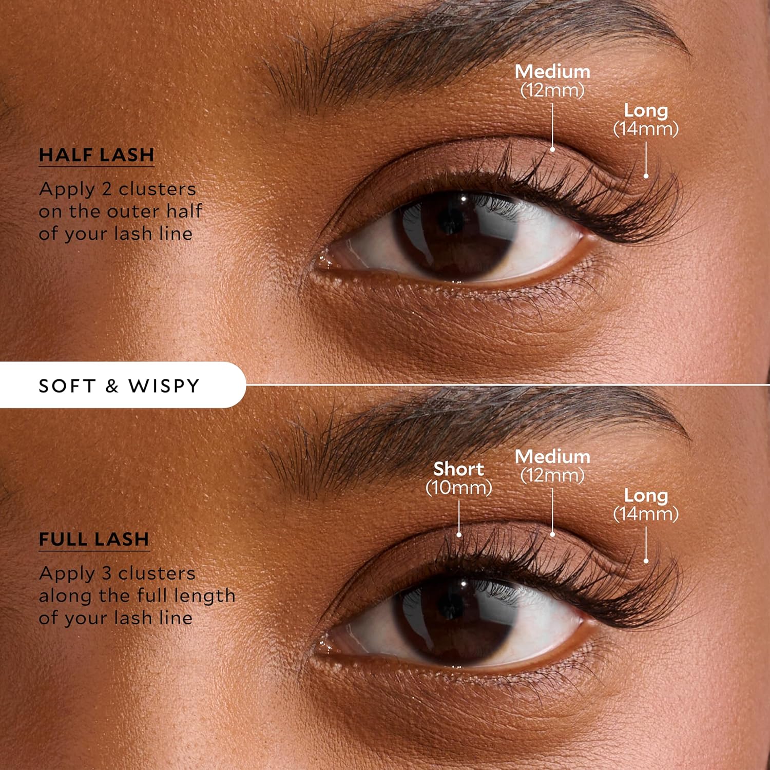 - VALUE CLUSTER EYELASH EXTENSIONS - This pack includes 12x Soft & Wispy Velour-Xtensions Self-Stick Lash Clusters: 4x Short (10mm), 4x Medium (12mm), 4x Long (14mm).
