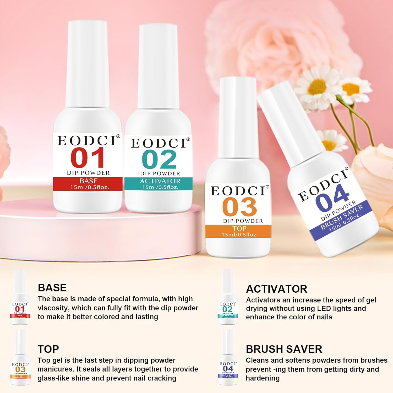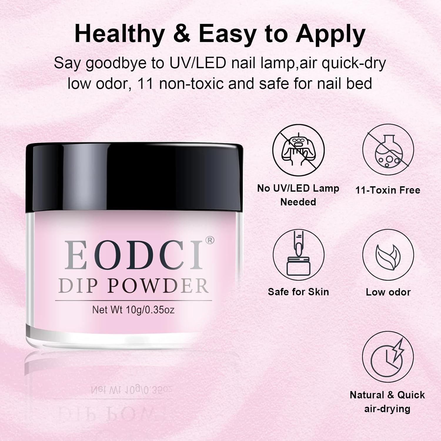- ăNo Lamp NeededăEodci Nail Dipping Powder does not require UV/LED light to cure, is skin friendly while avoiding skin darkening and damage, safe and easy to use, suitable for beginners and professional nail salons.