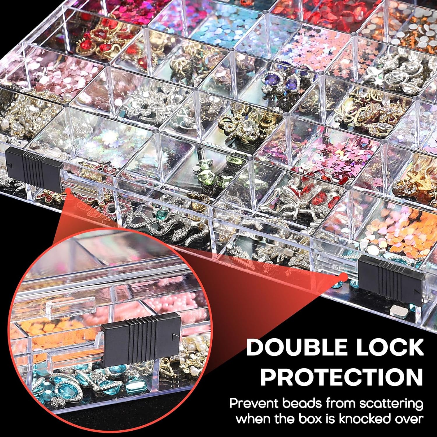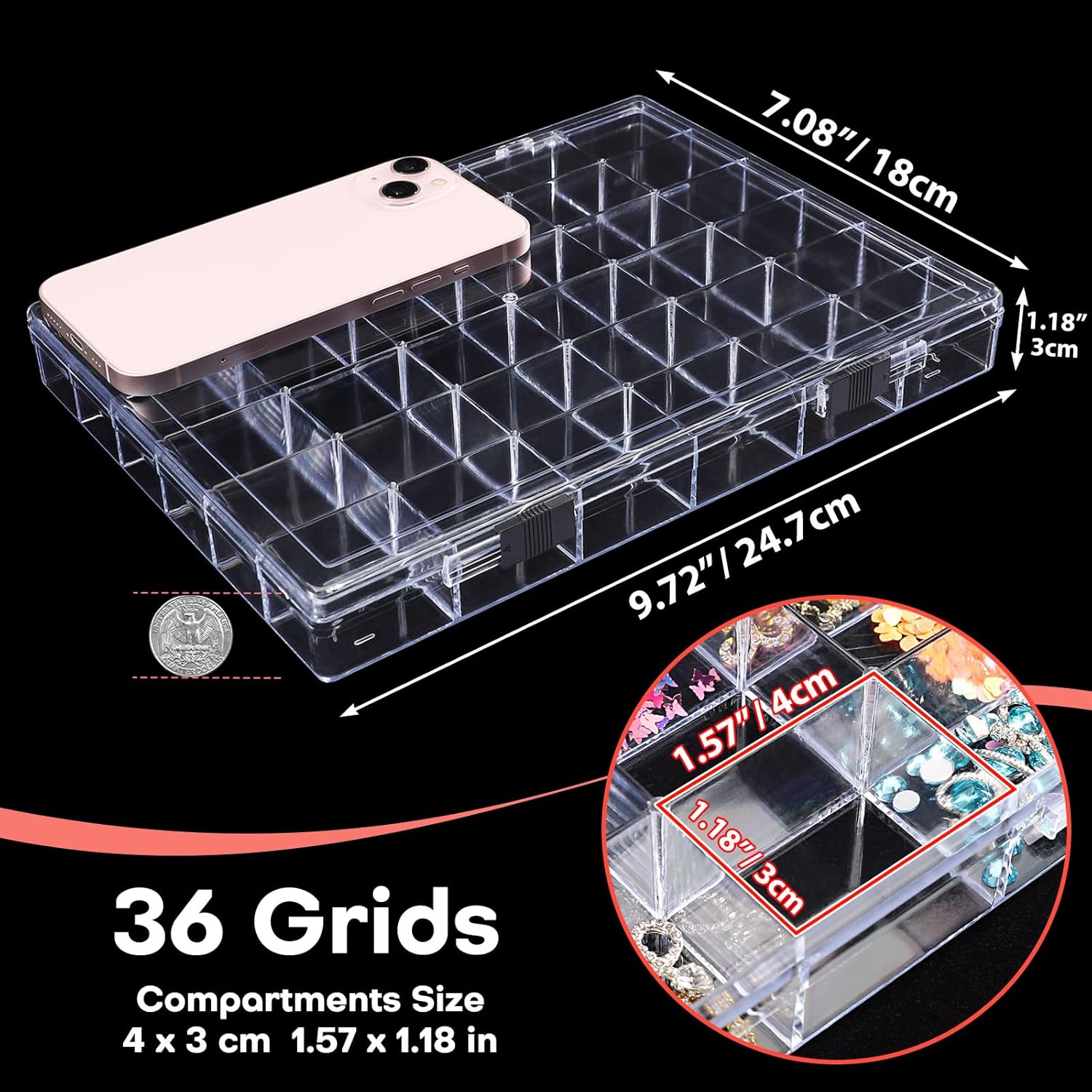- 【36 Grids Large Capacity & Double Buckle】-- This clear organizer measures 9.72 x 7.08 x 1.18 inches / 25 x 18 x 3 cm. Designed with 36 individual compartments for storing small parts or supplies, keep them away from mess up. Unique transparent appearance creates attractive display, which every female will fall in love with at first glance