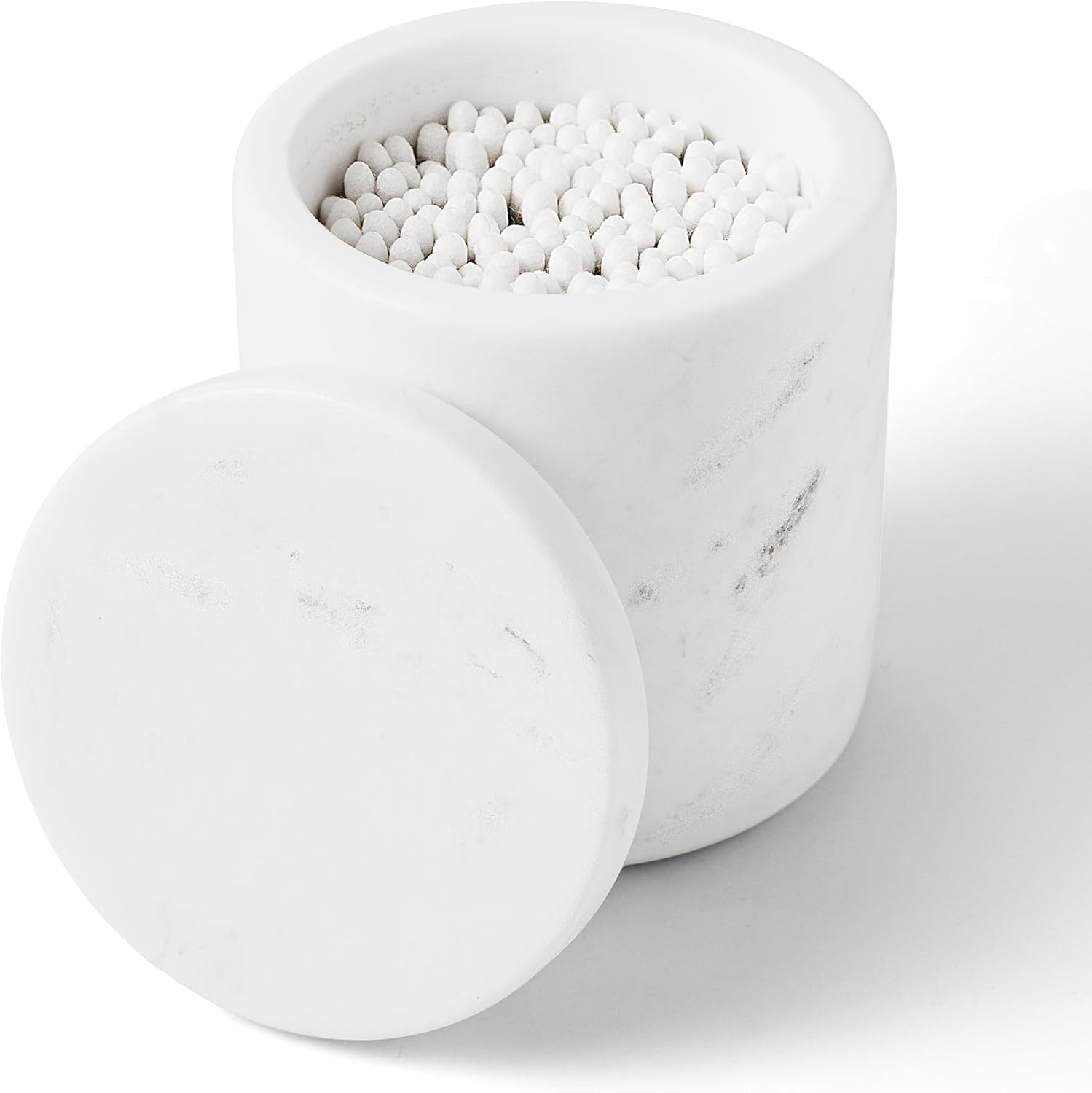 WORHE Marble Qtip Holder with Lid Natural Cotton Ball Container for Cotton Swabs,Makeup Sponges,Bath Salt Large Capacity Bathroom Canisters Jars for Countertop Storage and Organization White (WH051)