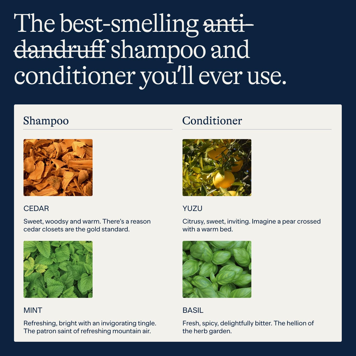 - Smells like a Forest, Not a Locker Room: Meet the best-smelling anti-dandruff shampoo and conditioner for men. Synthetic fragrances can irritate the scalp. We took the time to create 100% natural fragrances to give you the best experience possible Enjoy our shampoo’s sweet, woodsy, and warm cedar scent and our conditioner’s refreshing yuzu and basil smell. Be the best-smelling man in the room.