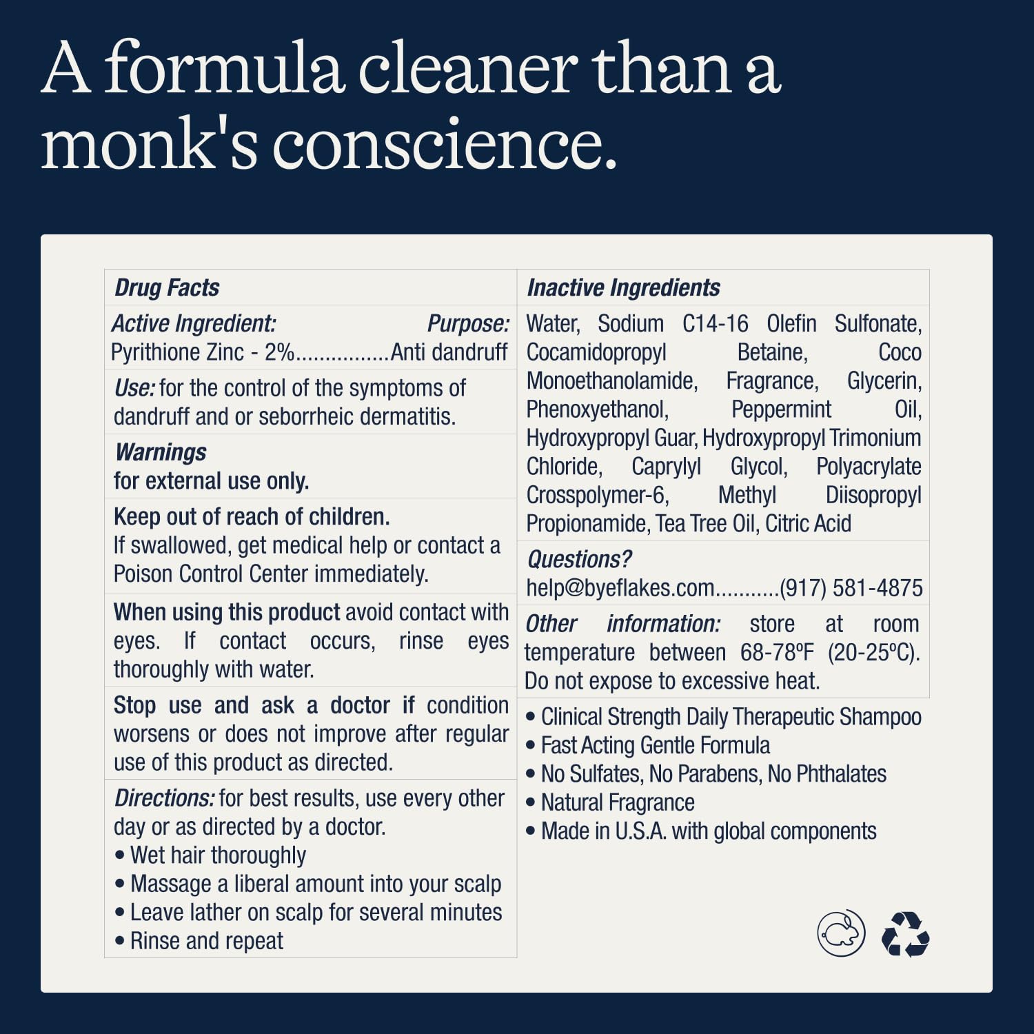 - A Formula Cleaner Than a Monk's Conscience: No sulfates, no parabens, no PEGs, no harsh ingredients that actually make dandruff worse. We designed a formula to stop dandruff and strengthen hair because no one should be worried about hair loss, a flaky scalp, or wearing black shirts.