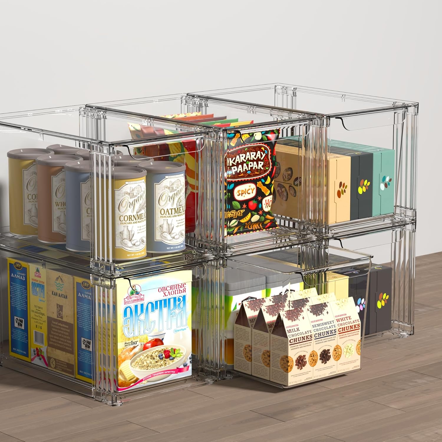 - Easy Pull-Out Access & Simple Installation:These clear plastic storage bins allow you to quickly identify contents without removing the entire bin from your pantry. Equipped with built-in sliding rails for smooth opening and closing. Easily assemble by inserting the connecting holders into the bottom plate grooves and attaching the upper plate. Anti-slip silicone pads provide added stability, effectively solving your storage challenges.