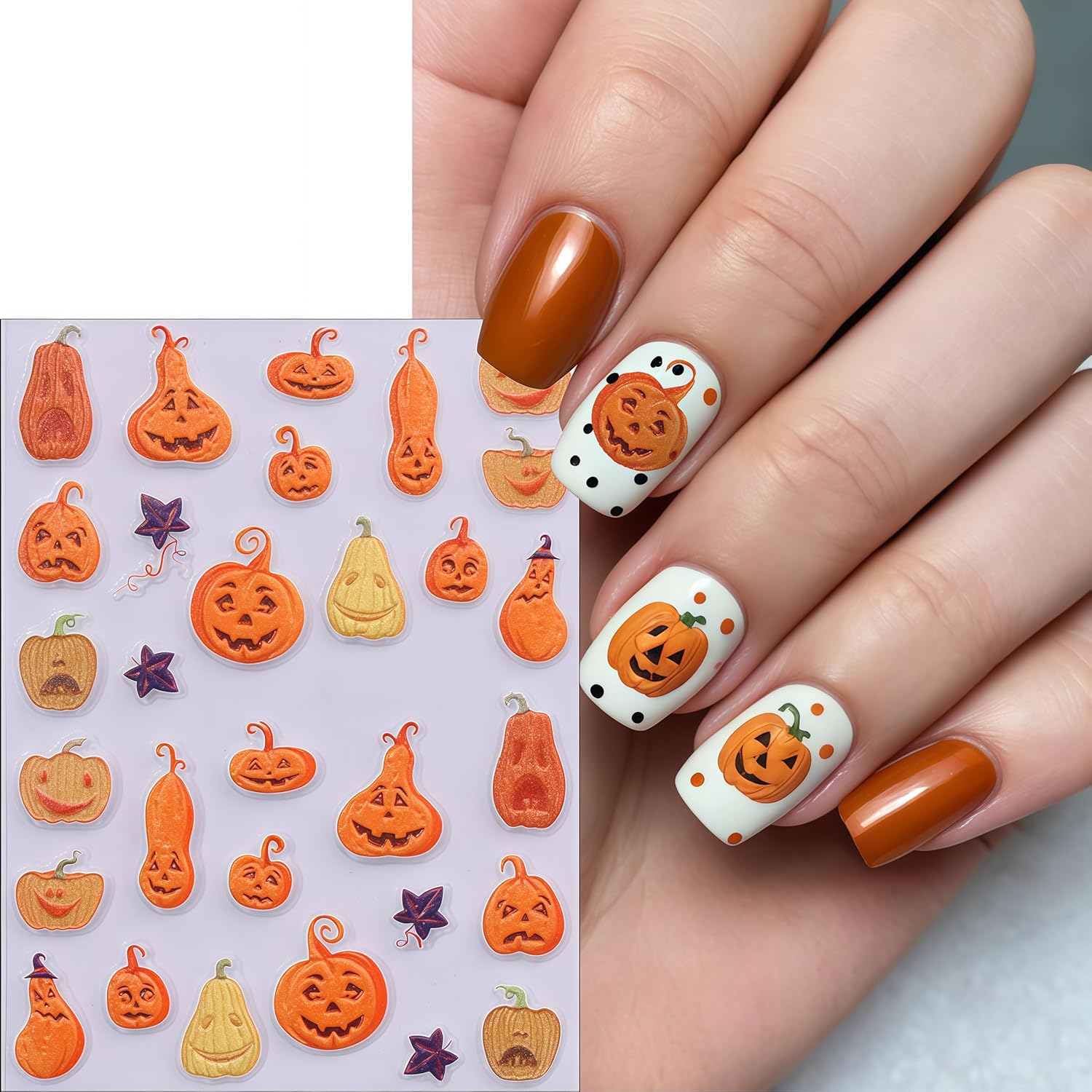 - Skull Pumpkin Self-Adhesive Design: 5D cute nail decals for nail art design is simple and quick to use, nail stickers work great on bare nails, they will stay on for a long time and will not peel off your nails, enjoy the feeling of nail art