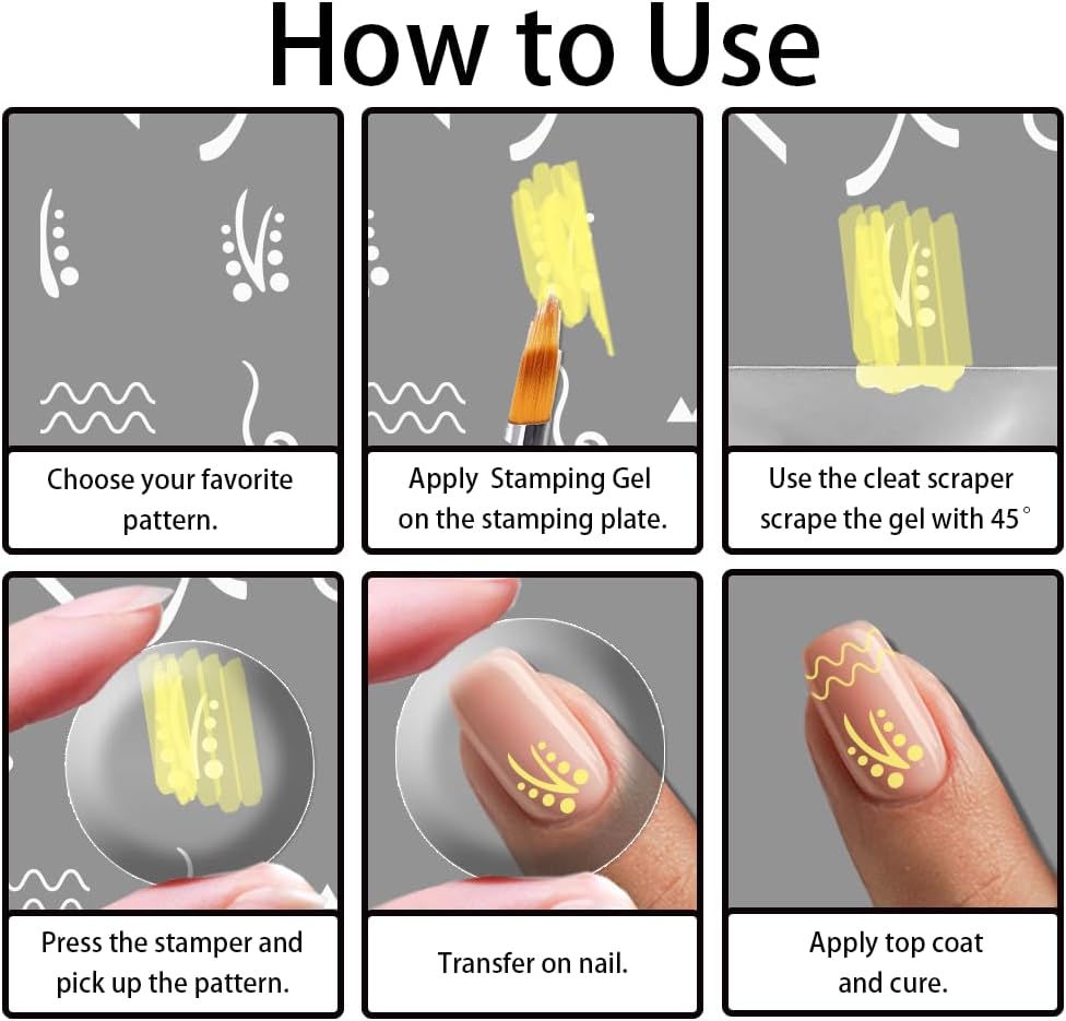 - Easy to Use: 1. Apply paint adhesive to the stencil, then use a scraper to quickly scrape off the excess 2.Use a silicone stamper to press down on the transfer pattern 3. Quickly transfer the pattern onto your nails 4.Bake dry to apply sealer then shine the lamp