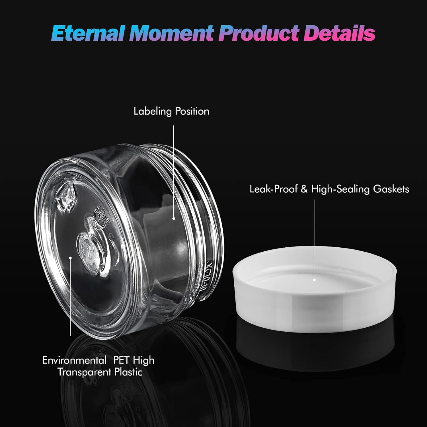 - ★【LEAK PROOF AND AIRTIGHT】: The foam liner on the top lid creates an airtight seal that provides good protection for your items when the lid is securely screwed onto the container. You do not need to worry about leakage, especially when you carry them in your bags. See-through plastic jars with lids display your contents
