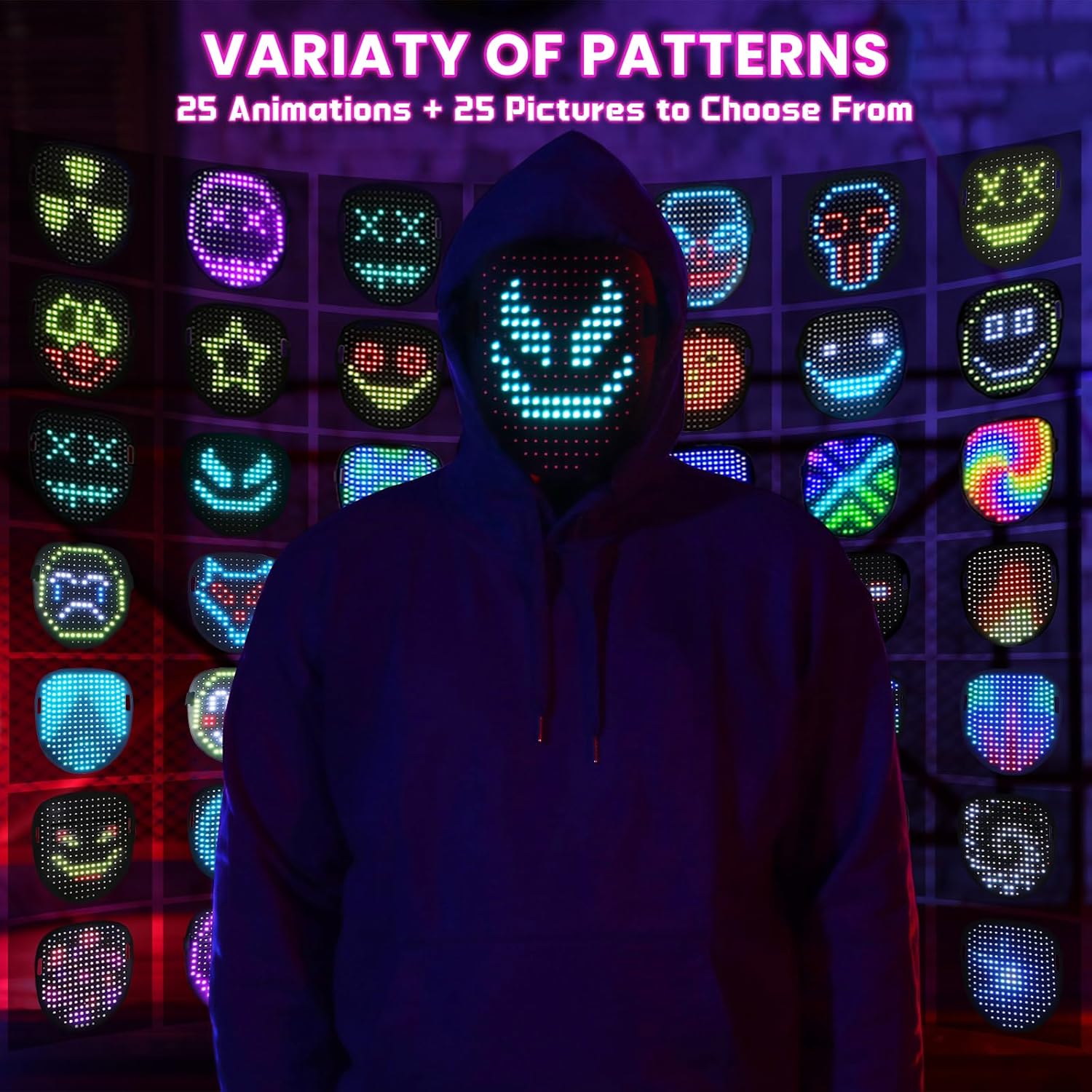 - 50 Cool Face Patterns: : Our Halloween LED mask has 25 dynamic and 25 static patterns, featuring 234 high-brightness LED beads. Experience stunning clarity and vibrant light displays.