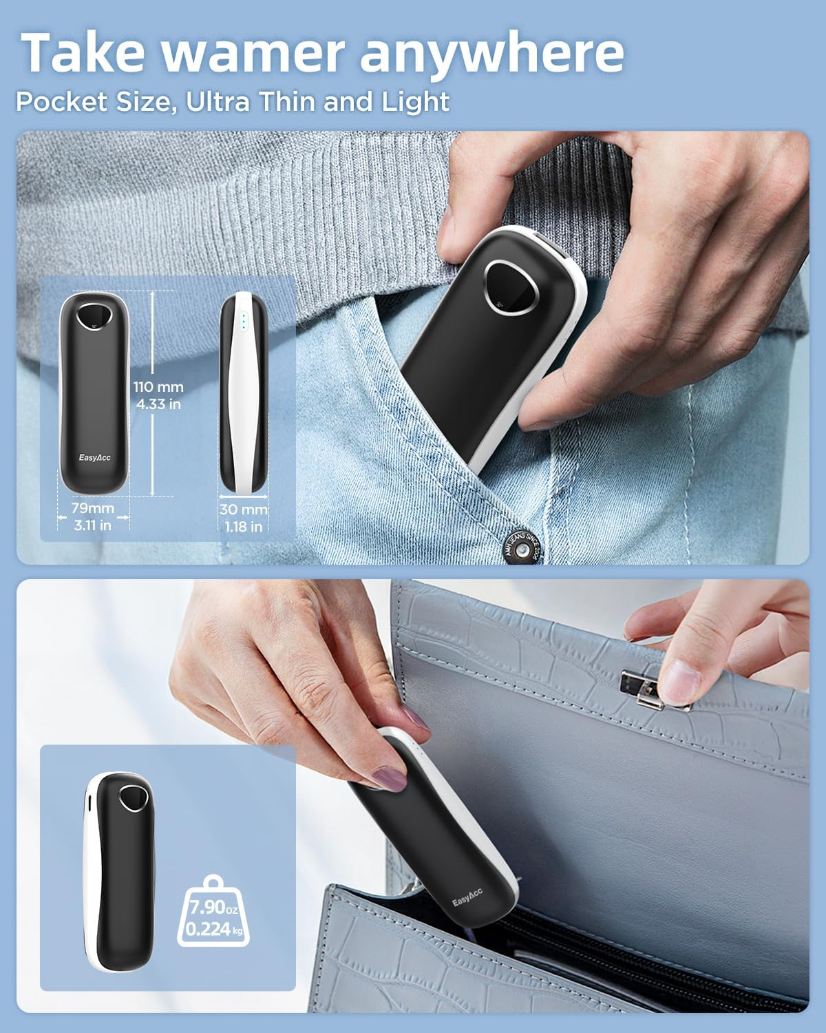 - 【The Palm-Friendly Design】: After 3 years of research, EasyAcc launched the most suitable hand warmers rechargeable for palm grip, perfect fit in the palm of your hand, Ergonomic design is comfortable to hold. The perfect winter companion for you and your Lovers!