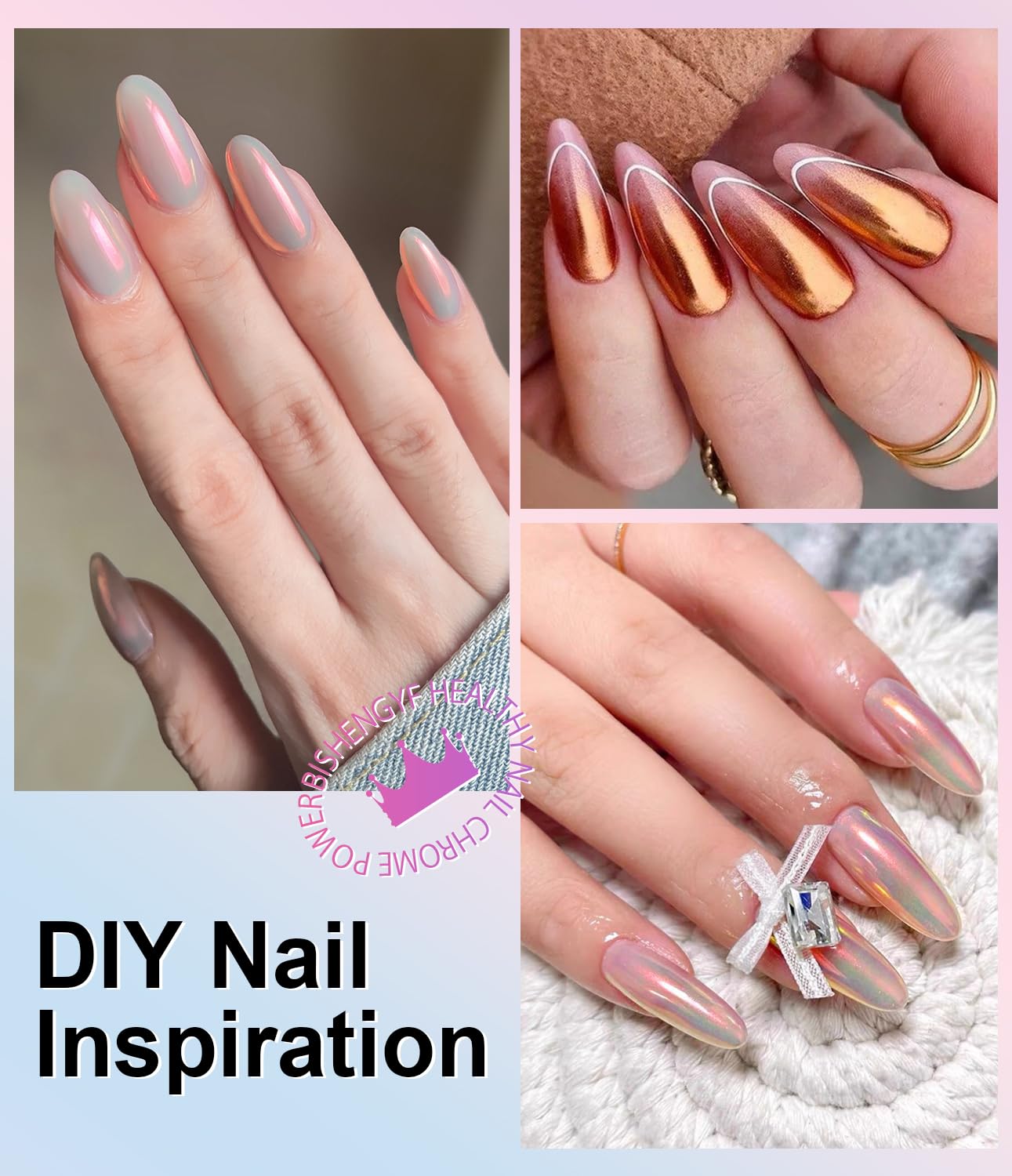 - Mirror Effect: BISHENGYF unique mirror effect chrome nail powder design of the pink glitter series chrome powder for nails can not only significantly enhance the sense of fashion and individuality of nail art,but also orange chrome nail powder add a touch of unparalleled glamour and fun to your overall look.
