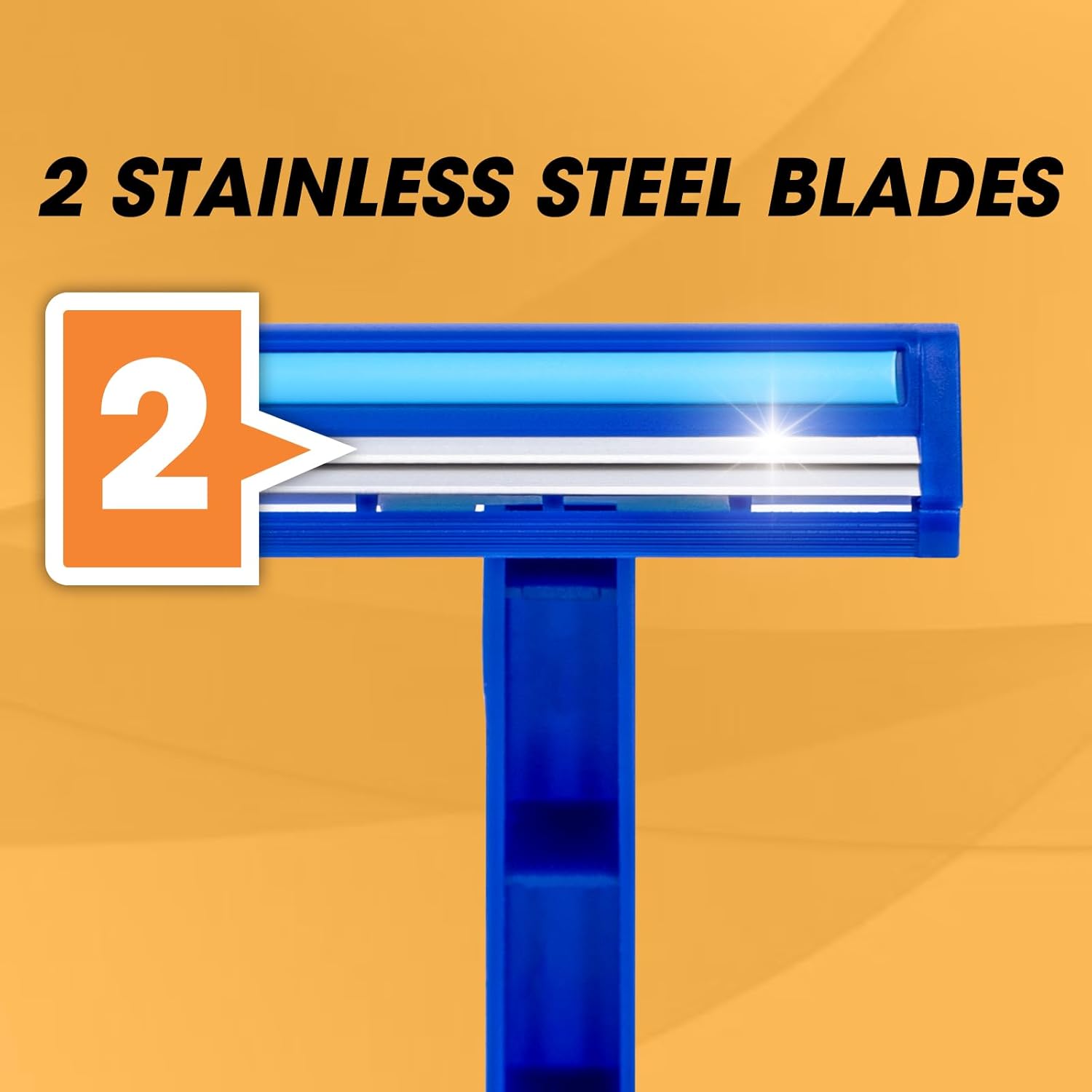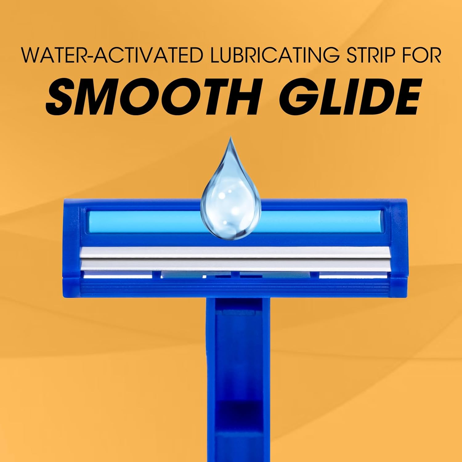 - Lubricating Strip: These blue disposable razors boast a lubricating strip, water-activated lubricating strip for smooth glide, that protects skin from irritation, for a a safer, more comfortable shave