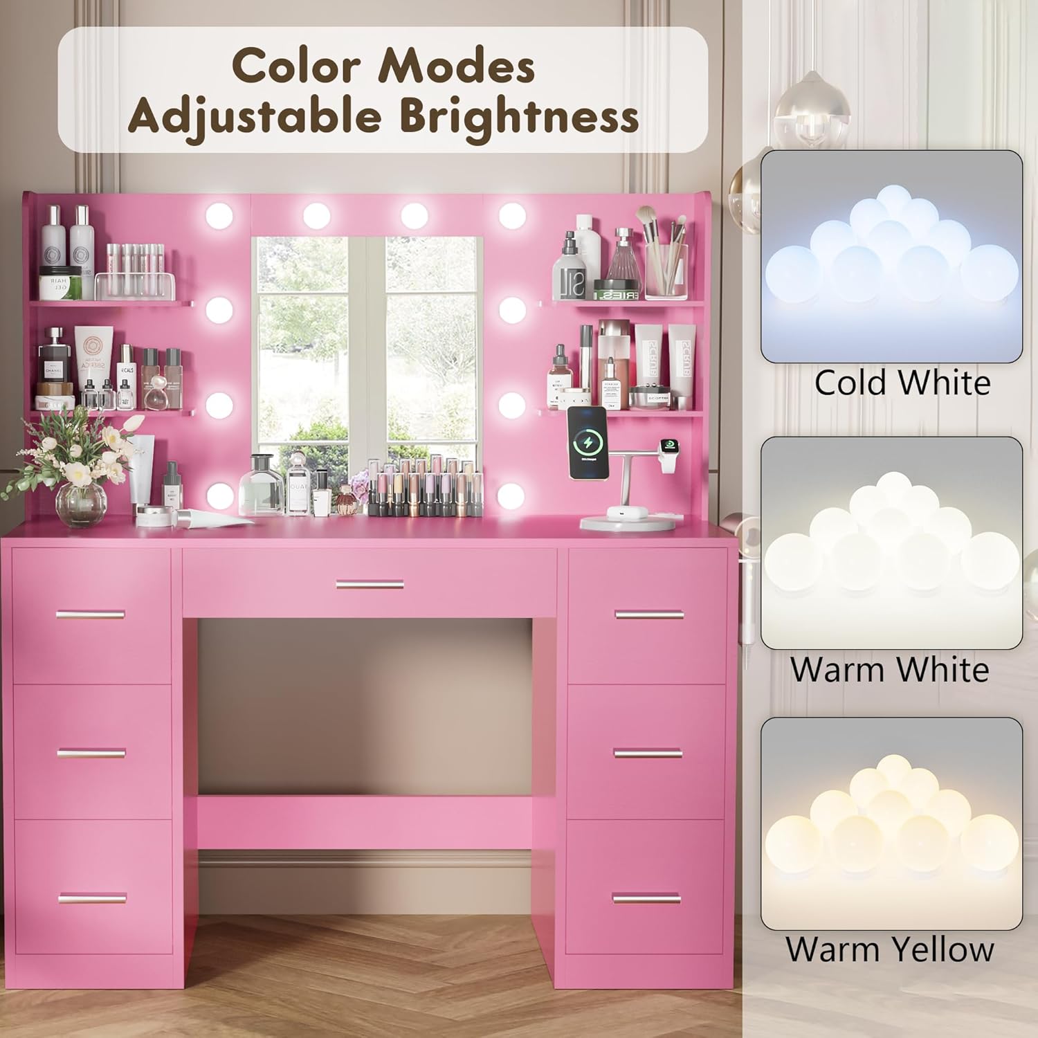 YESHOMY Vanity Desk with Mirror, Power Outlet and 10 Lights, Makeup Table with 7 Drawers, 3 Color Modes Available for Bedroom, Pink