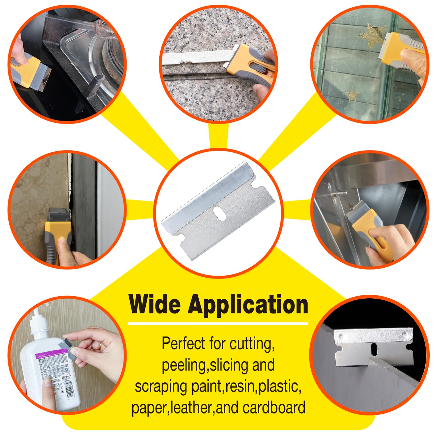 - These blades are widely used and can easily complete heavy-duty cutting tasks, cutting tough materials such as leather, cardboard, and plastic, also suitable for scraping paint, cutting paper, DIY projects, etc.; they are ideal for professionals and home use.