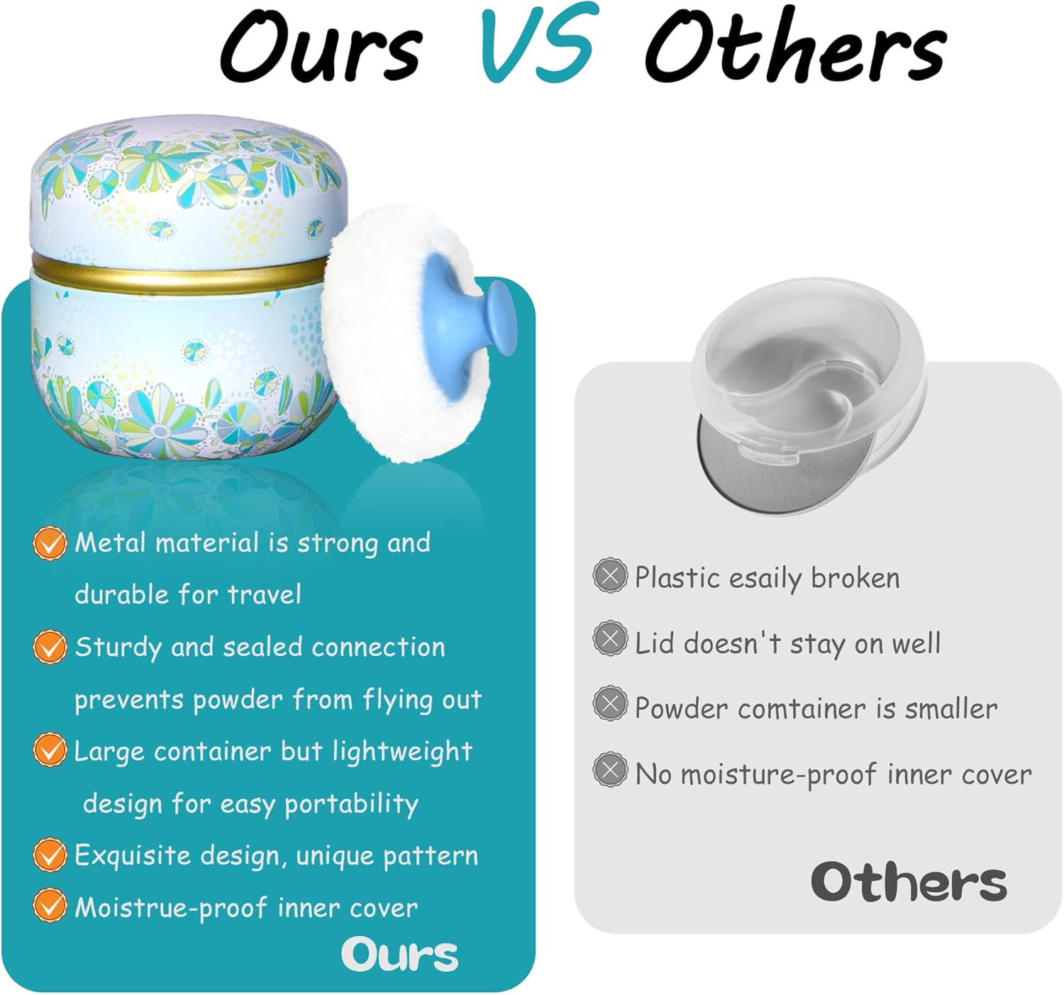 - Product contains a well-made powder case, a high quality powder puff with a handle and a small powder puff.