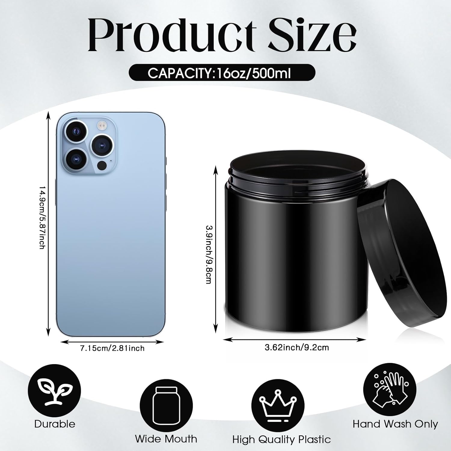 - What You Receive: there are 4 pieces plastic jars with black screw-on lids; They are durable and refillable, measuring about 16 oz in capacity