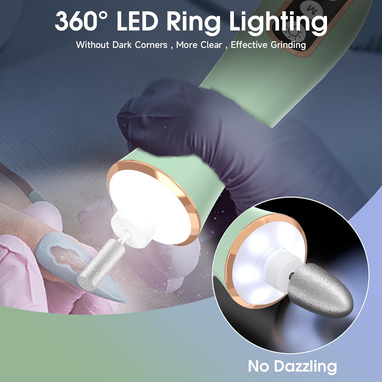 Cordless Electric Nail Drill with 360° LED light&10 Speeds, Professional Manicure Pedicure Kit, Rechargeable Pedicure Tools for feet, Hand Foot Care Nail Drill for Thick Nail Toenail Cuticle Women Men