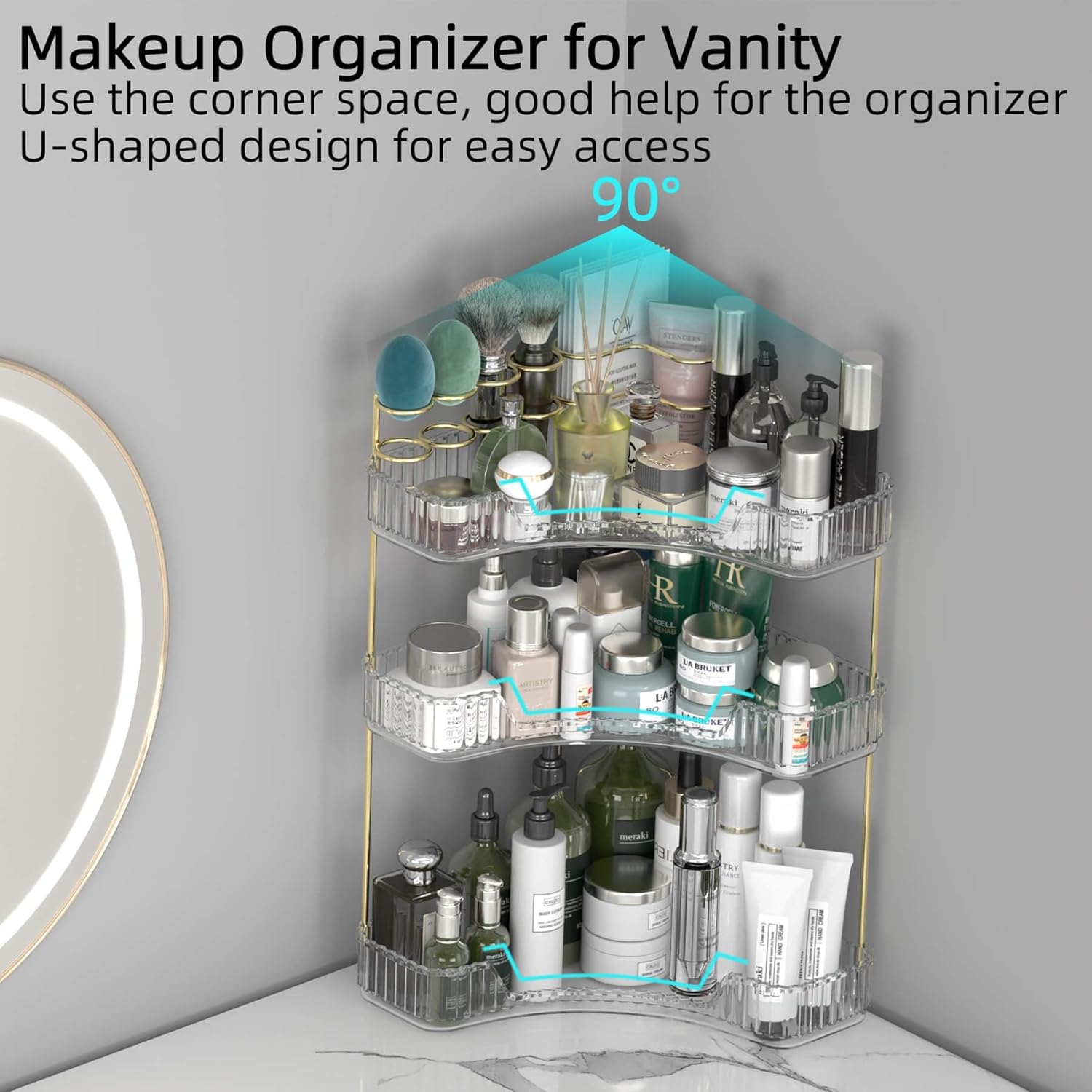 Makeup Organizer Countertop 3 Tier, Corner Bathroom Countertop Organizer with Toothbrush and Makeup Brush Holder, Corner Vanity Tray for Skincare Organization