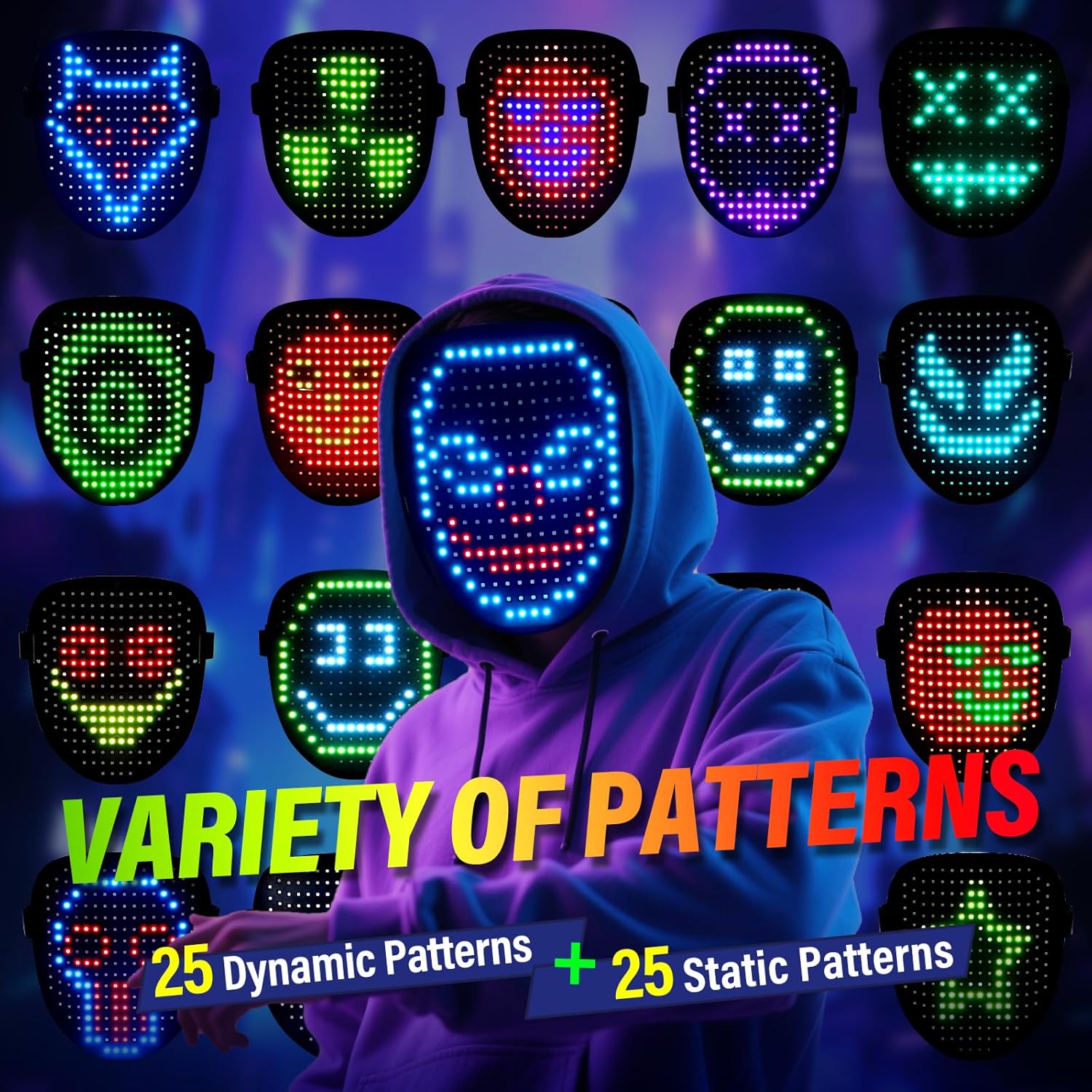 - 25 Graphics and 25 Dynamic Patterns: 50 cool cosplay costume mask can be cyclically switched through gesture sensing mode or buttons, Whether it's cosplay parties, birthdays, Halloween, Christmas, Carnivals, or Concerts, LED light up masks are the perfect choice