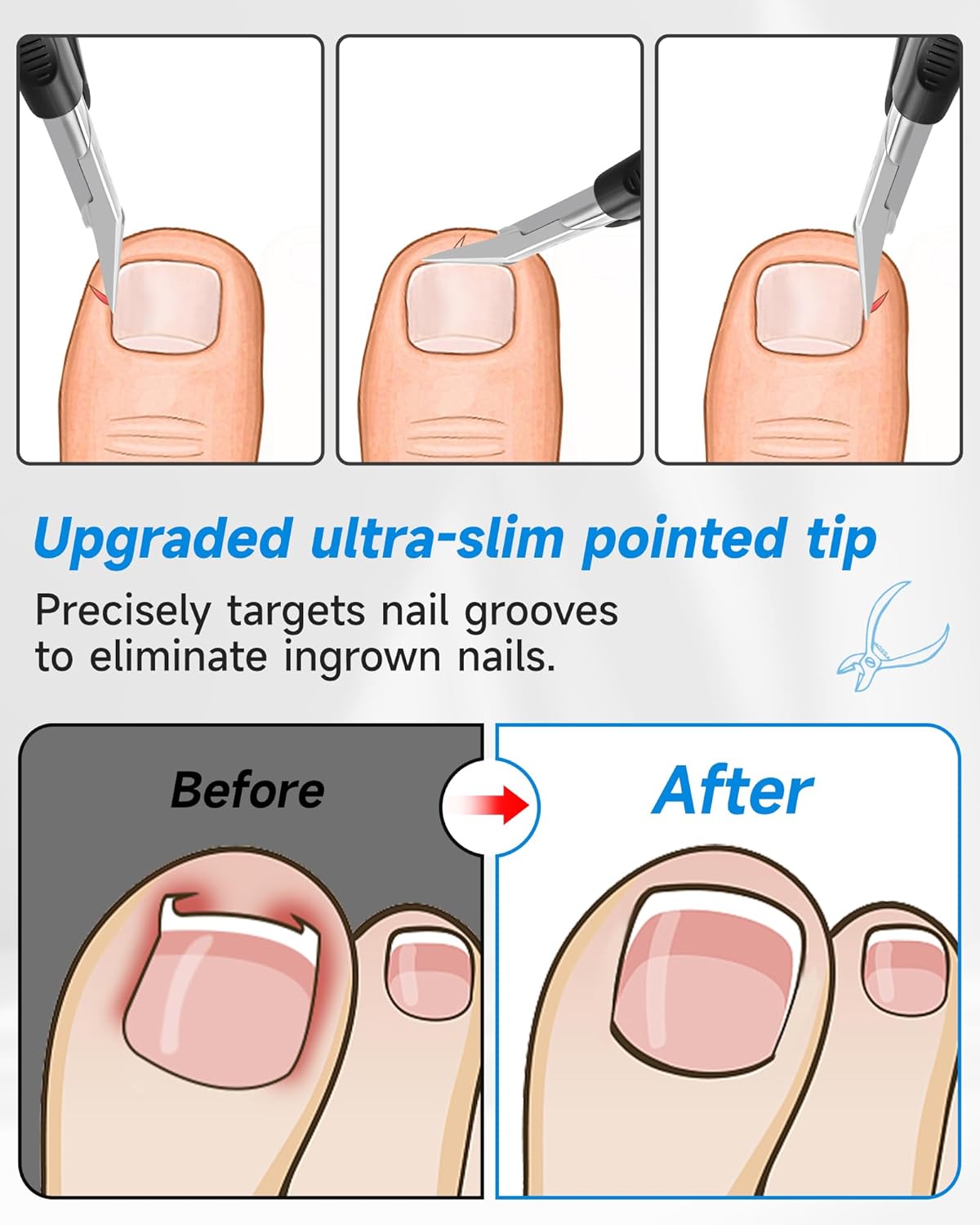- 【Professional-Grade Precision Design】Engineered with an 18mm extended blade + 30° angled edge to effortlessly reach deep into nail grooves. Perfect for trimming ingrown toenails, thick nails,hangnails, and dead skin. The upgraded ultra-slim pointed tip targets embedded nails while dual-V blades power through hard nails.