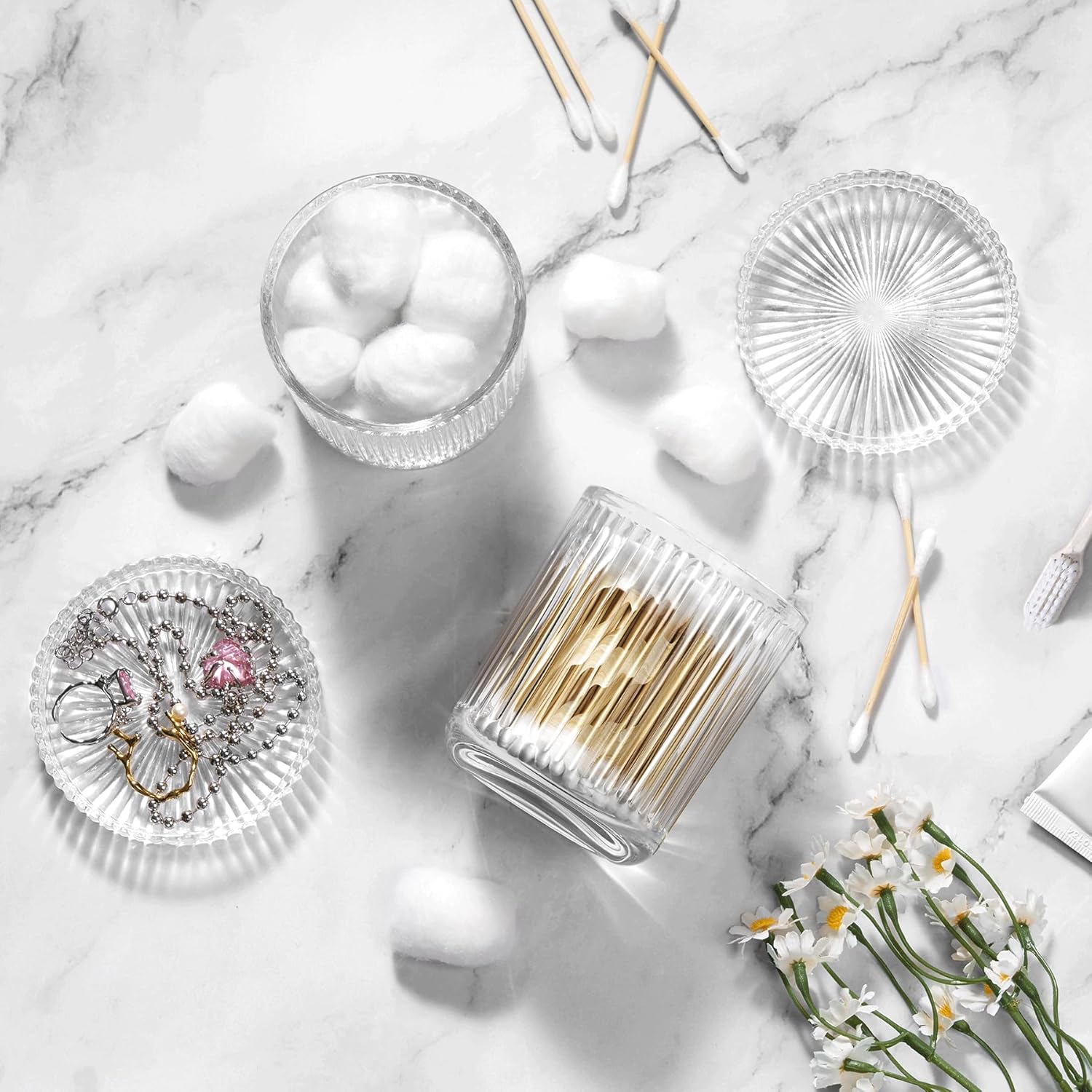 - BATHROOM ORGANIZER & STORAGE - Glass qtip holder with lid (9.8oz, 3.9 x 3.5 inch). Perfect bathroom organizer for cotton swabs, cotton balls, pads, floss picks, bath salts, hair ties, and small bathroom accessories. Keep vanity, countertop, and bathroom storage neat and stylish