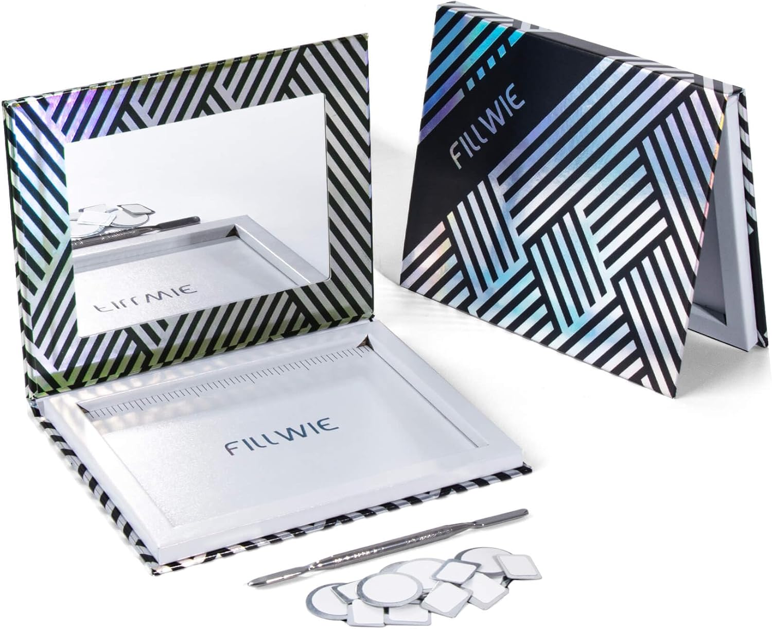 Empty Magnetic Makeup Palette with Mirror, Spatula, 20 Metal Stickers, Suitable for Eyeshadow Lipstick Blush Powder Highlighter and Contour, DIY Refillable, Holographic Stripes (Black, Medium)