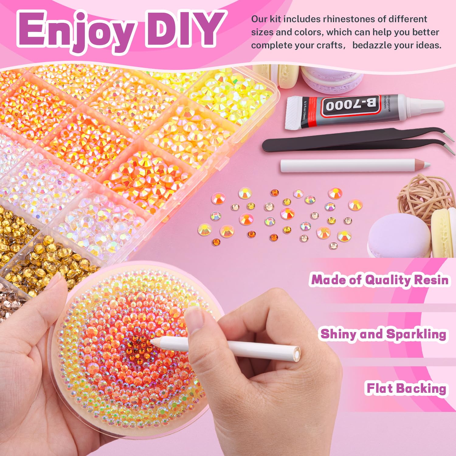 - PACKAGE CONTENT -- Include 1 box with 28 grids, featuring a variety of colors and sizes, approx. 20000 pcs bling-out resin rhinestones. 1 tweezers and 1 pickup pen are included for easily picking up of rhinestones. 3 B7000 glue for jewelry making. This all-inclusive set will meet all your needs to bedazzling your crafts