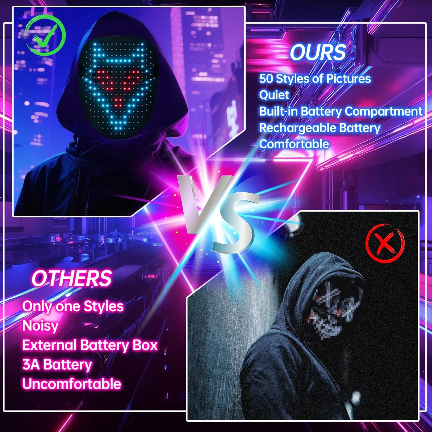 - [50 Patterns of Marvelous Display]:The LED mask has 25 dynamic display and 25 static display images. The LED full-face mask is the most magical costume & role-playing costume mask, attracting everyone's attention.