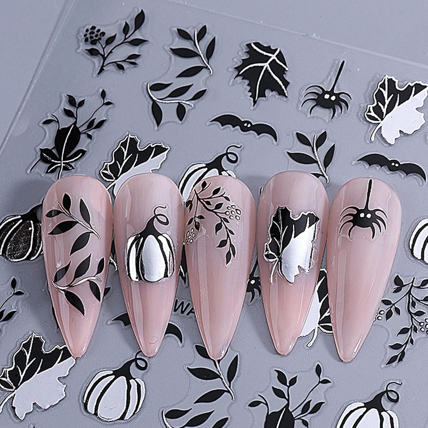 4 Sheets Halloween Nail Stickers Gold Silver Black Nail Art Stickers Pumpkin Maple Leaves Self Adhesive Nail Decals Spider Web Bat Ghost Leaves Design Nail Art Sticker Decoration for Women Girls