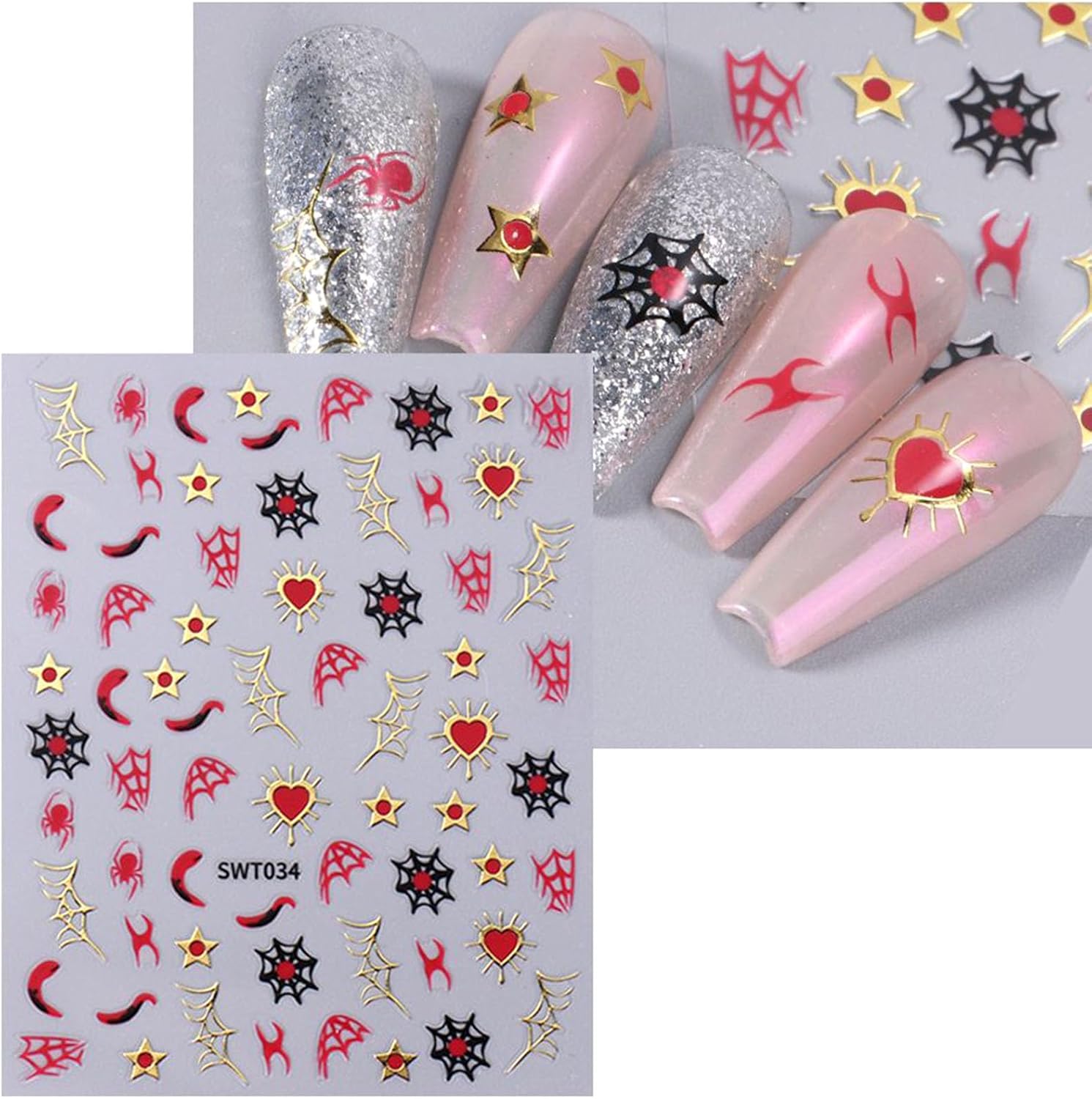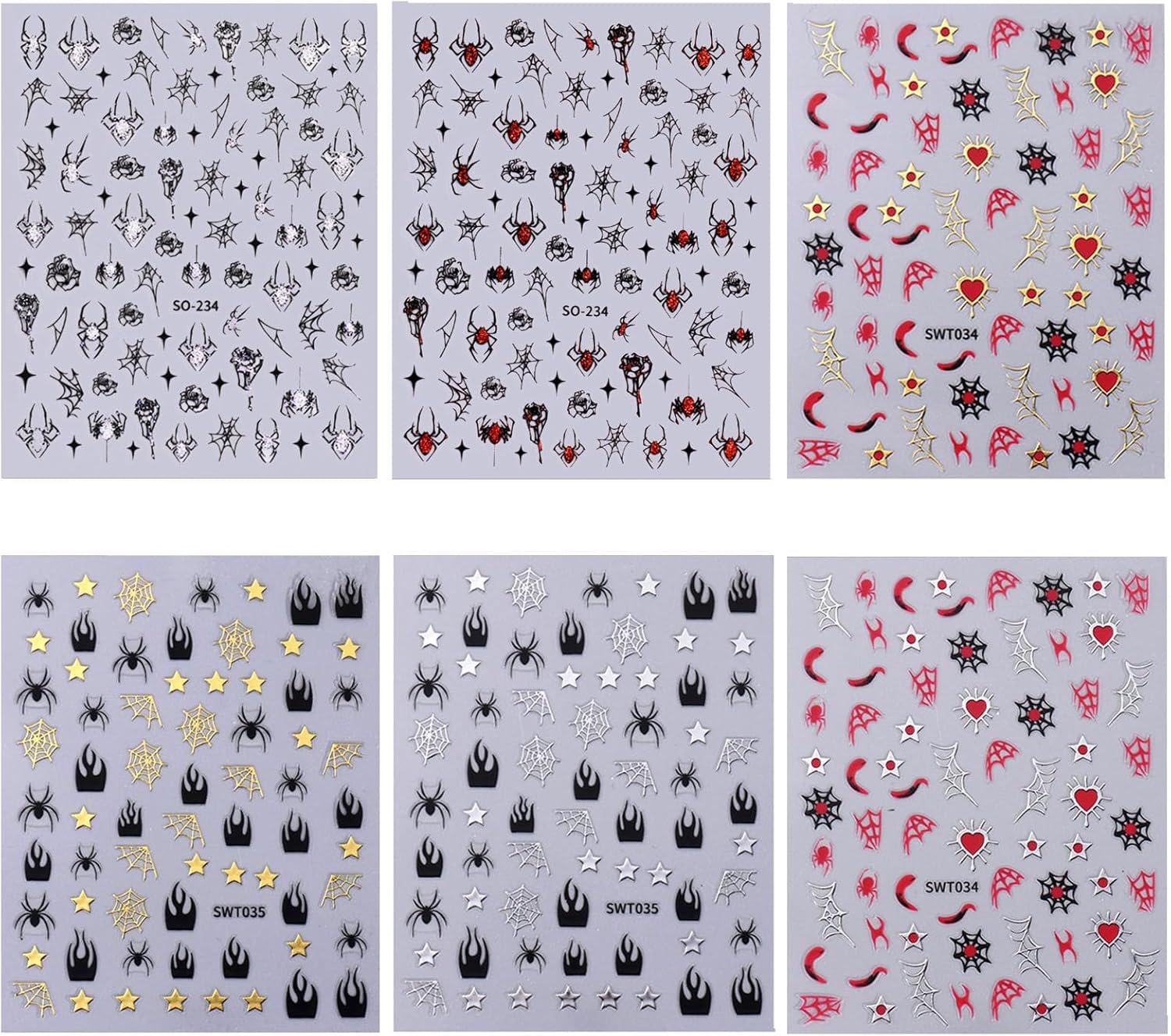 6 Sheets Halloween Nail Stickers Gold Silver Nail Decals for Nail Art Glitter Spider Nail Decals Spider Web Rose Stars Love Heart Design Nail Art Stickers for Women Girls DIY Nail Decorations